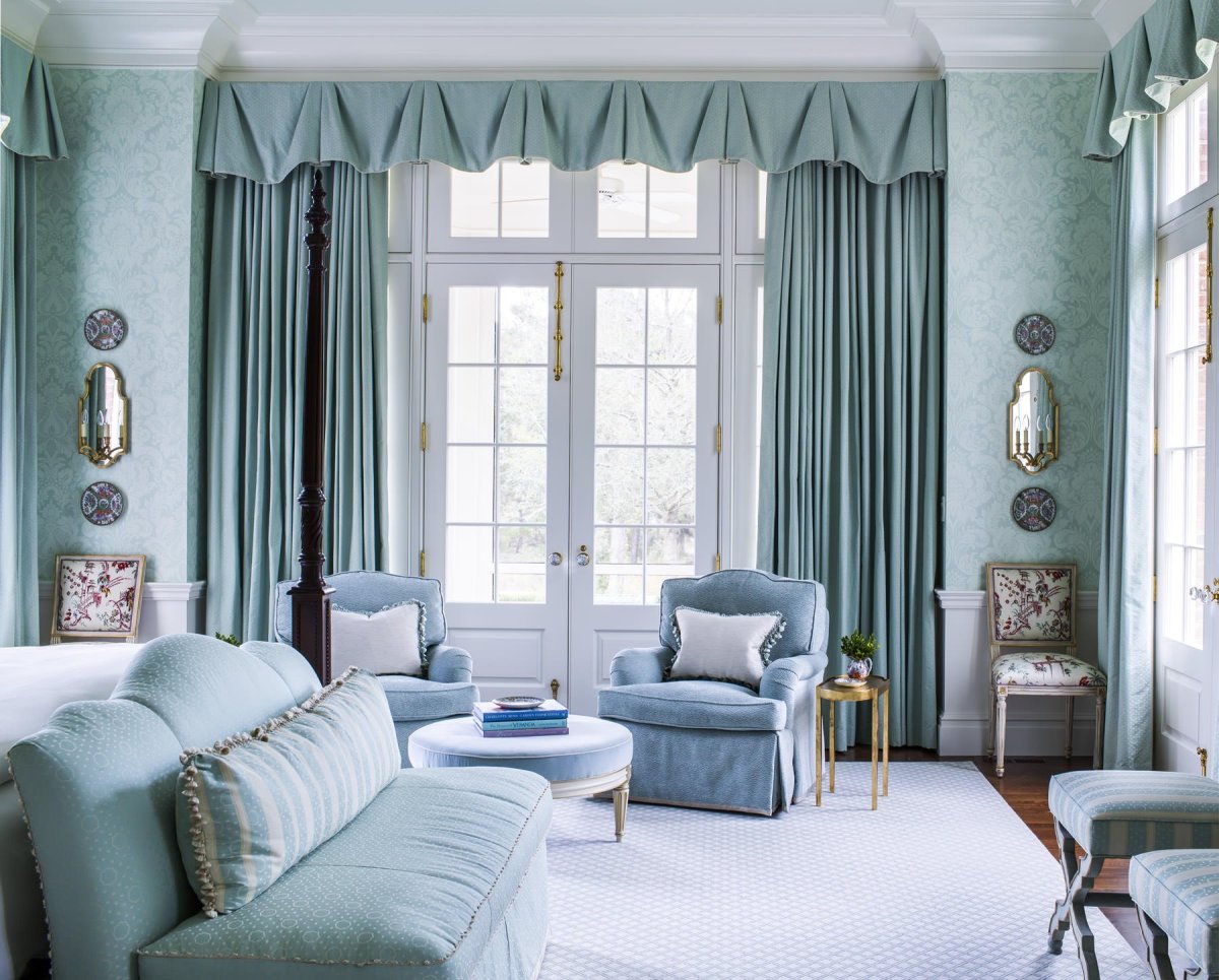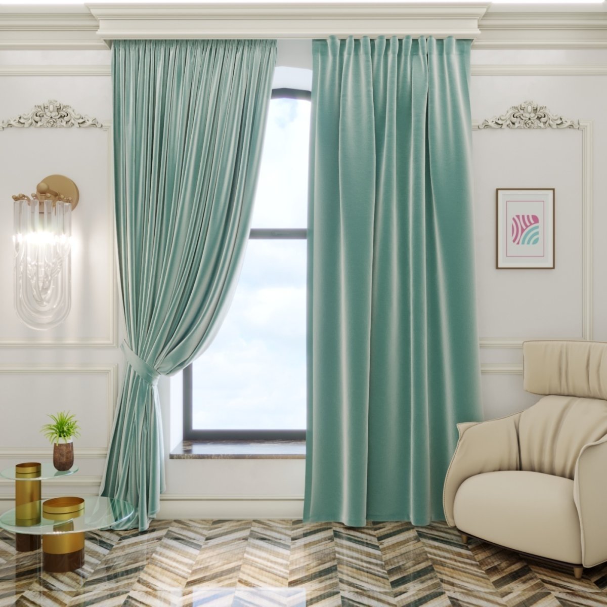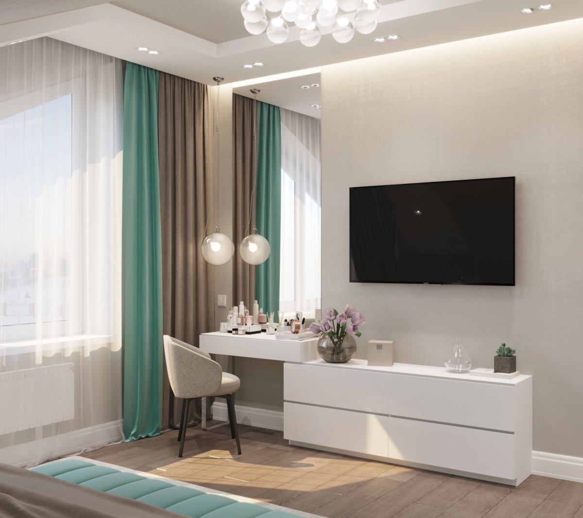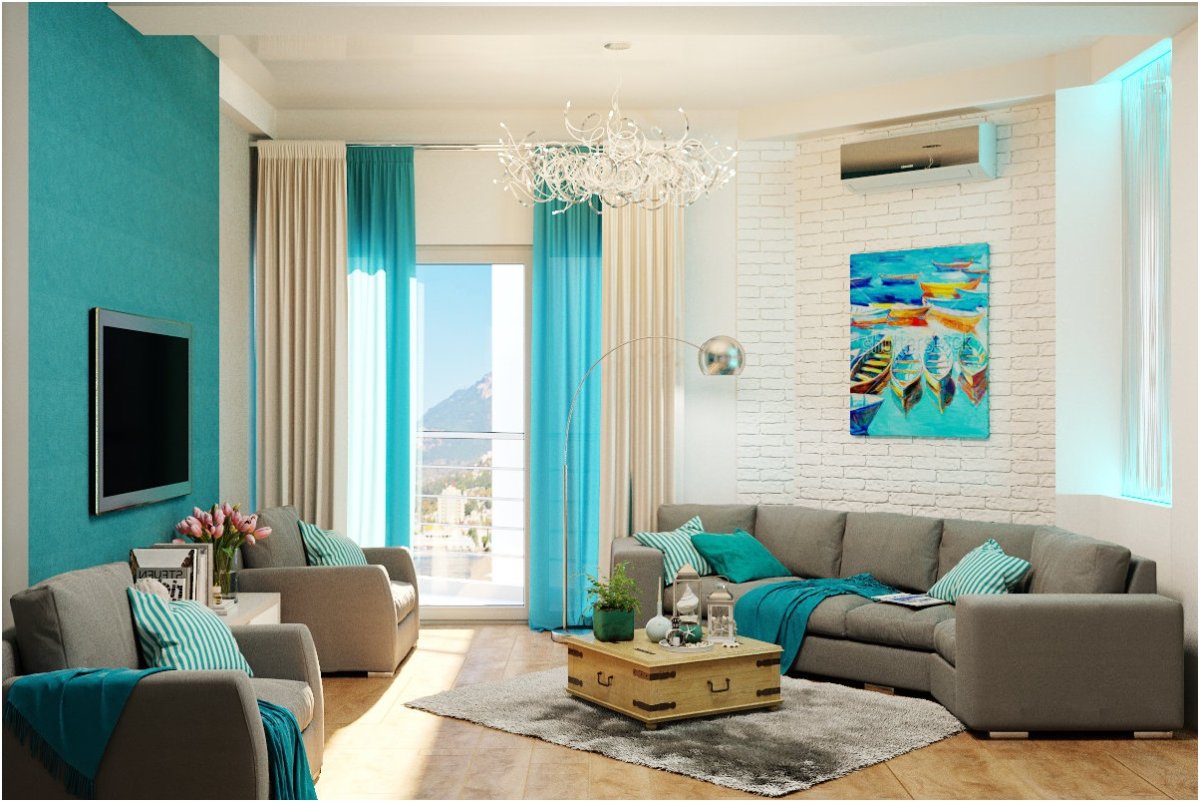 36. Бирюзовые шторы в интерьере гостиной в бежевых тонах