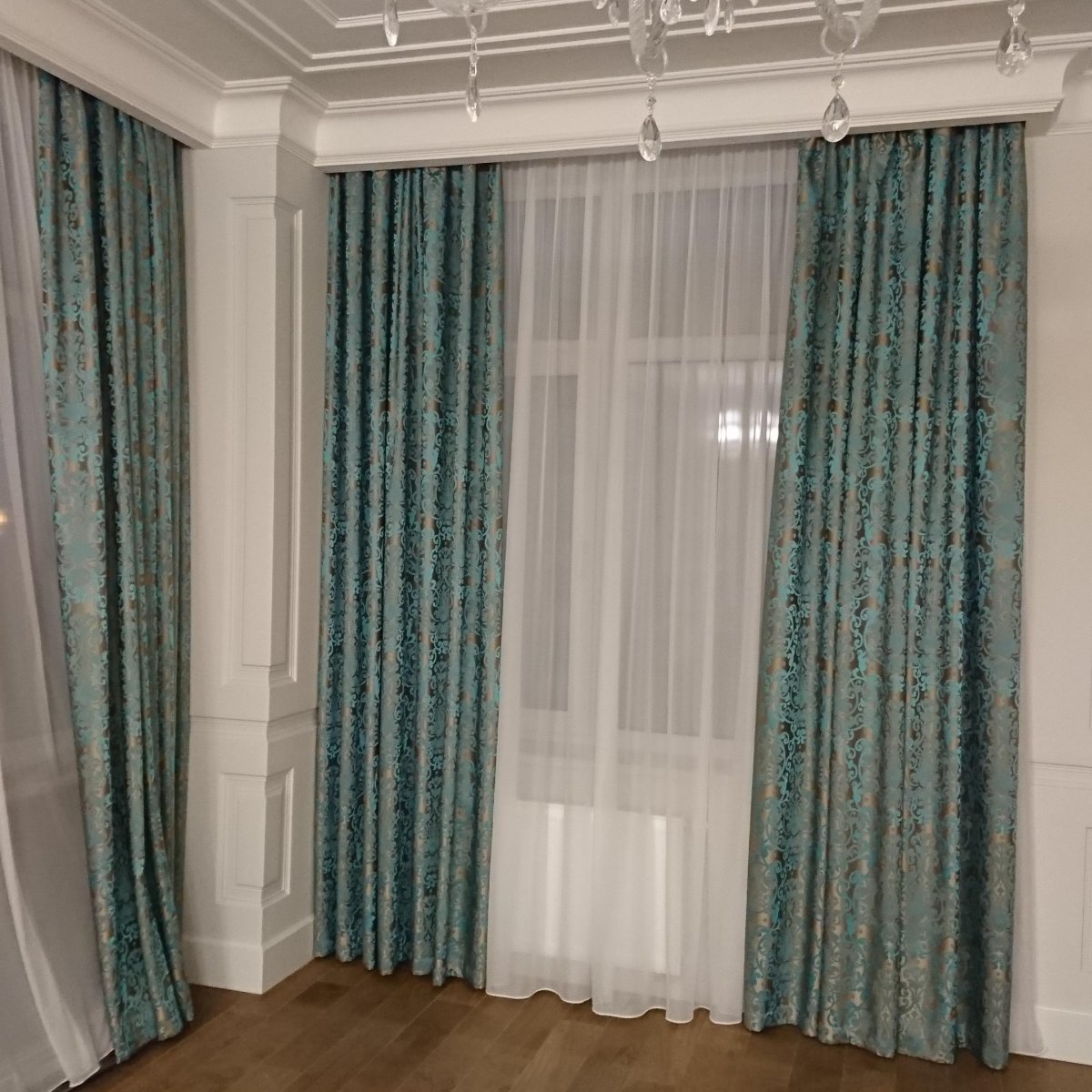 8. Бирюзовые шторы в интерьере гостиной в бежевых тонах