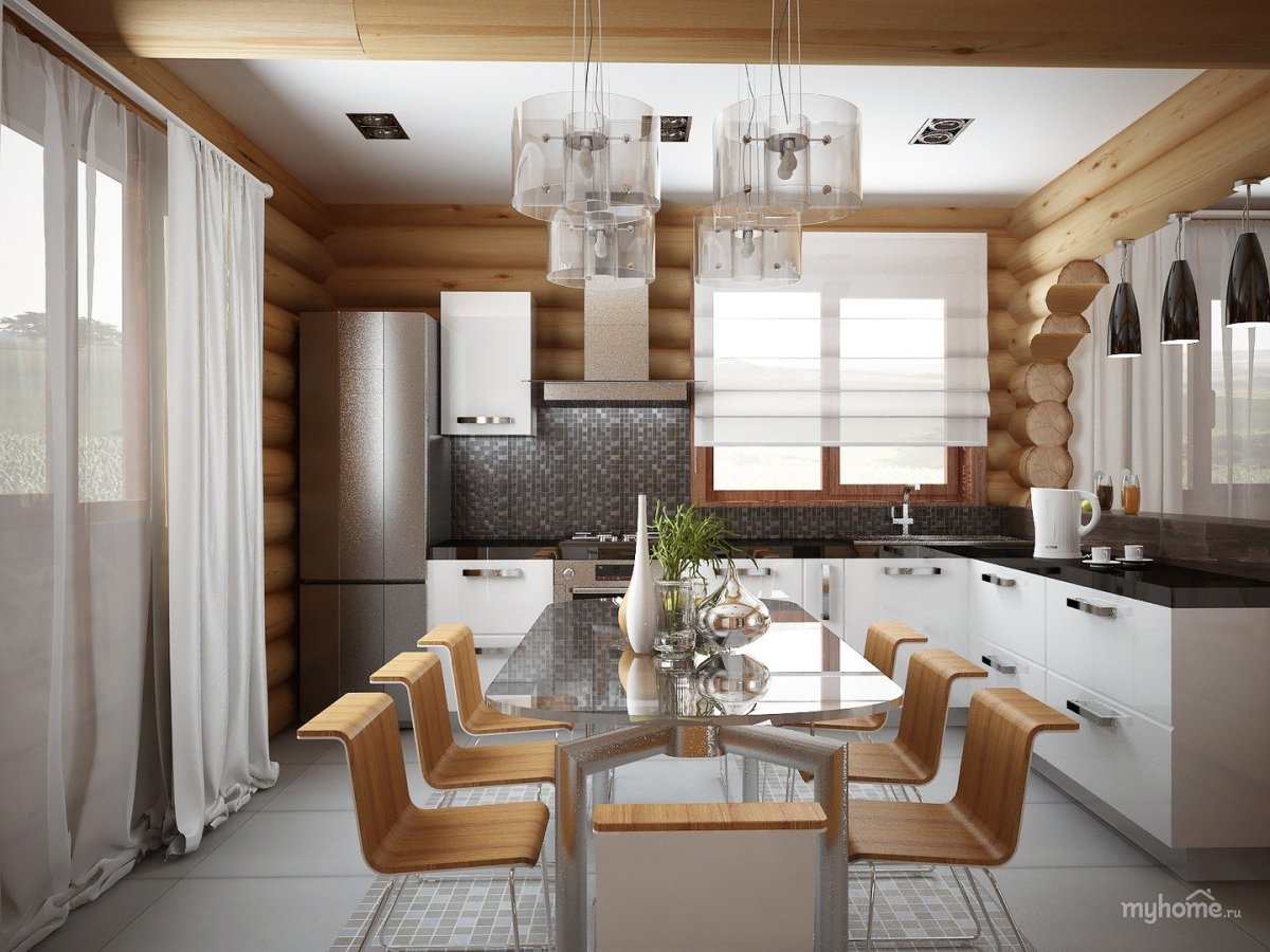 31. Интерьер кухни в деревянном доме из оцилиндрованного бревна