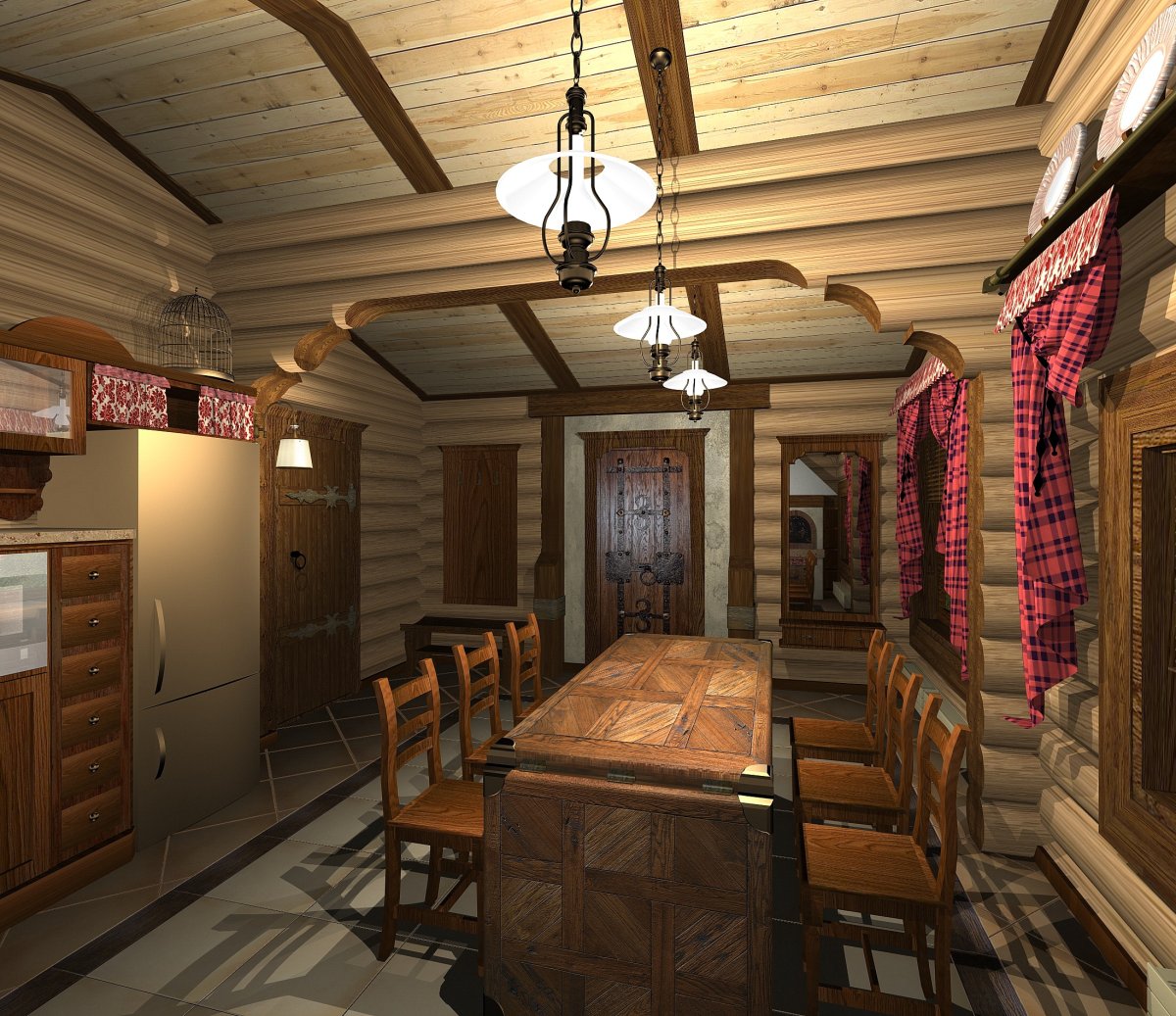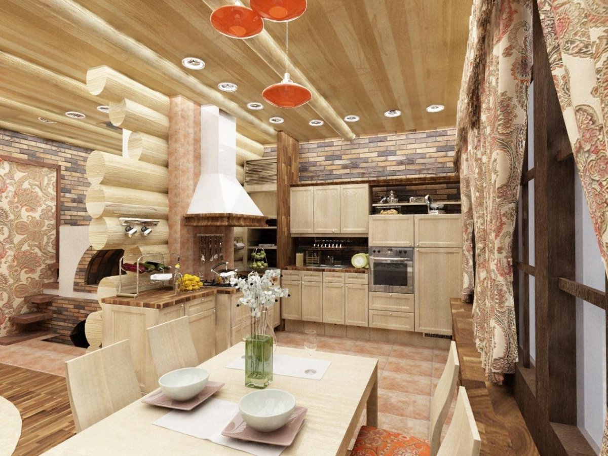 21. Интерьер кухни в бревенчатом доме в русском стиле