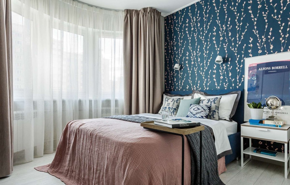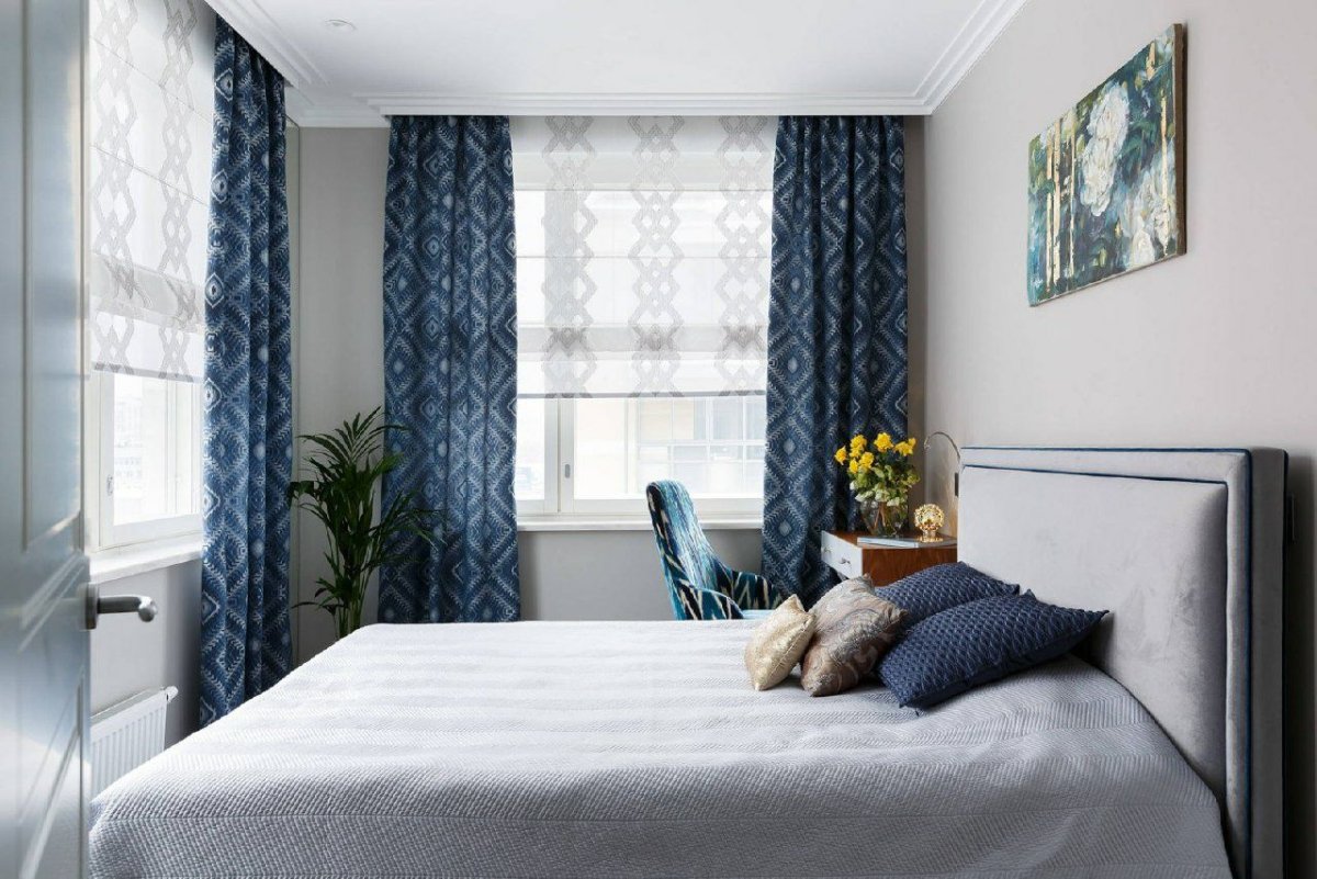 Фото: Планировка гостиной 20 кв.м с синими шторами