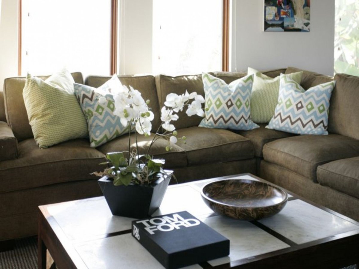 46. Коричневый диван с зелеными подушками