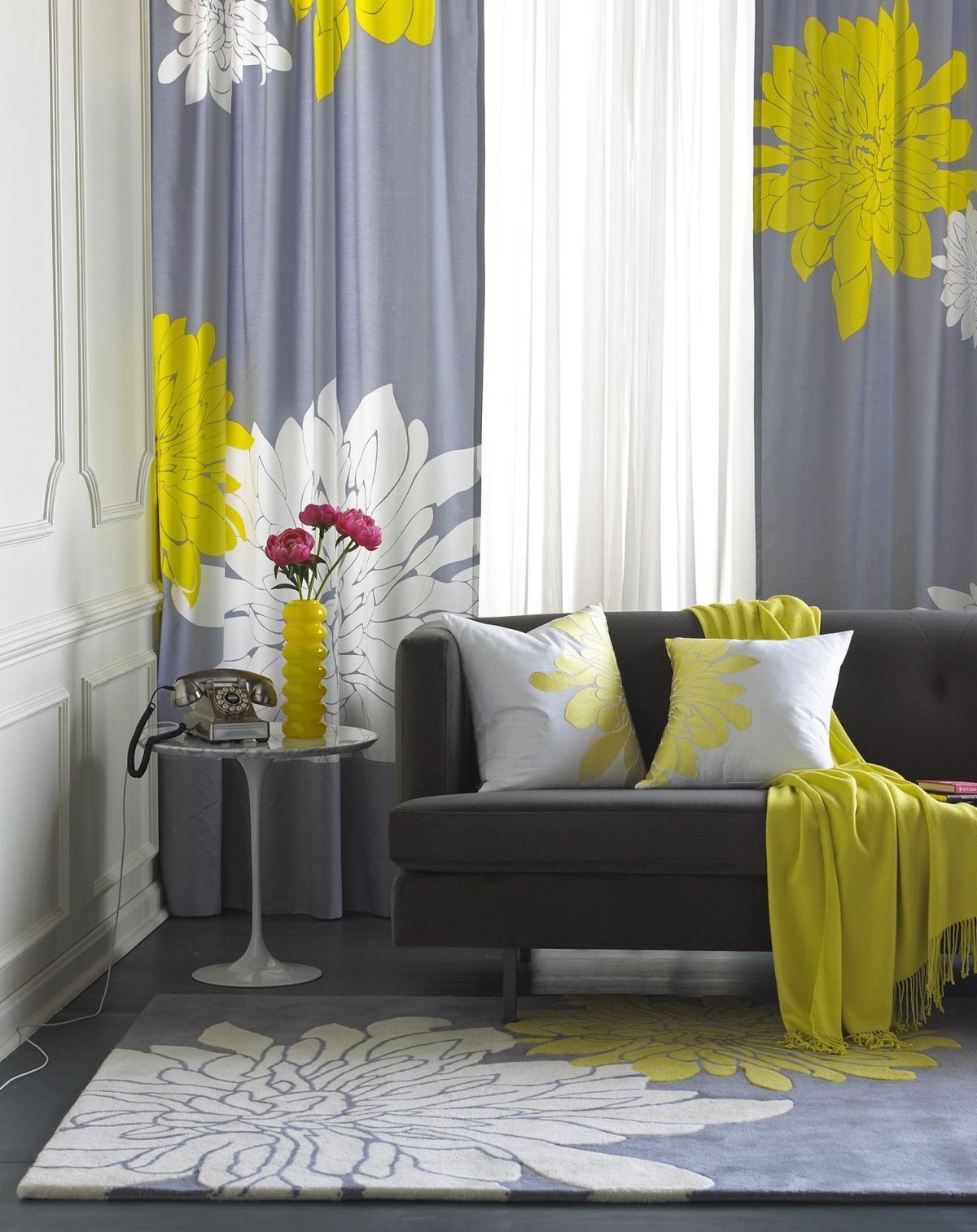 42. Желтые шторы в сером интерьере