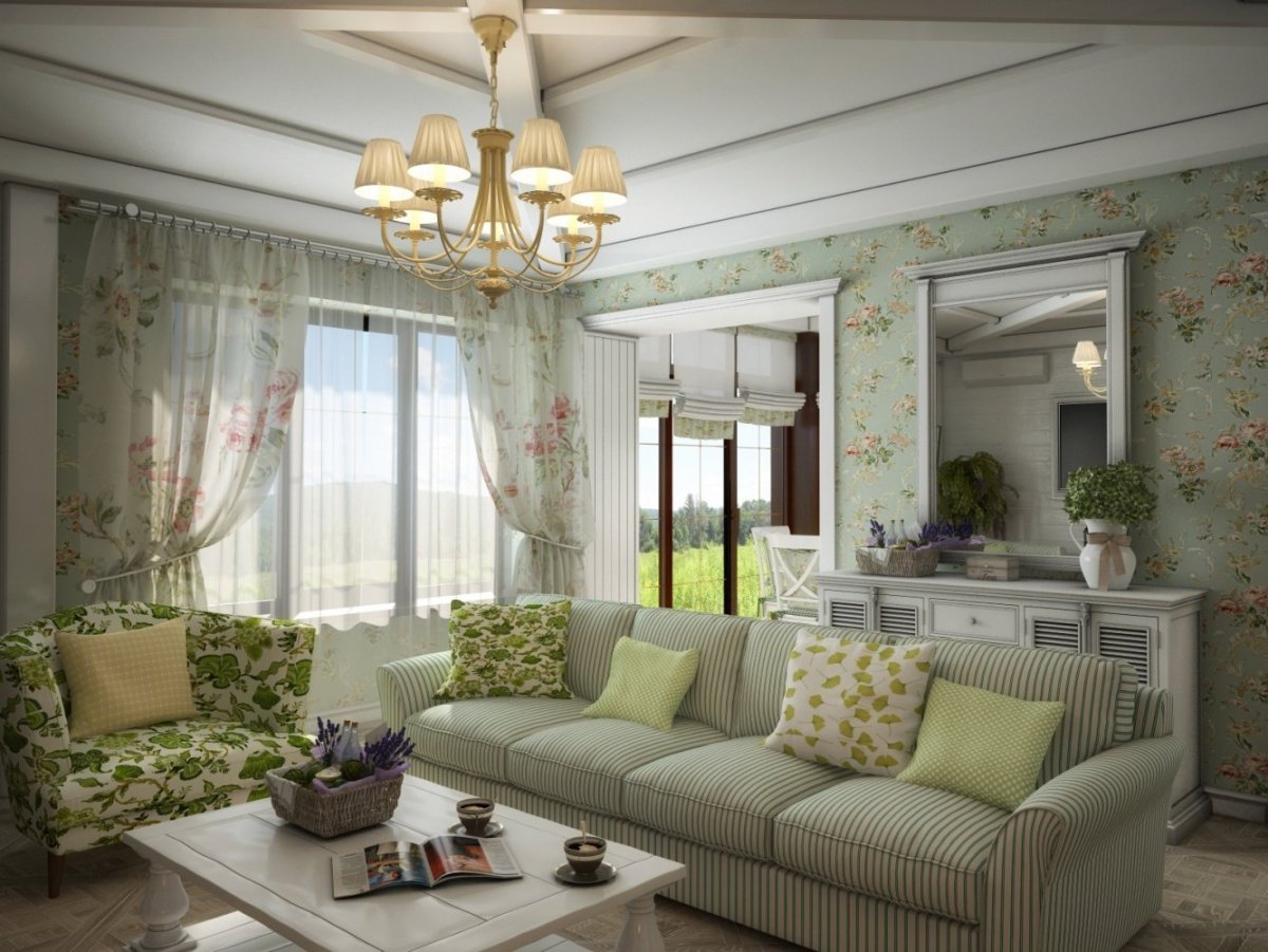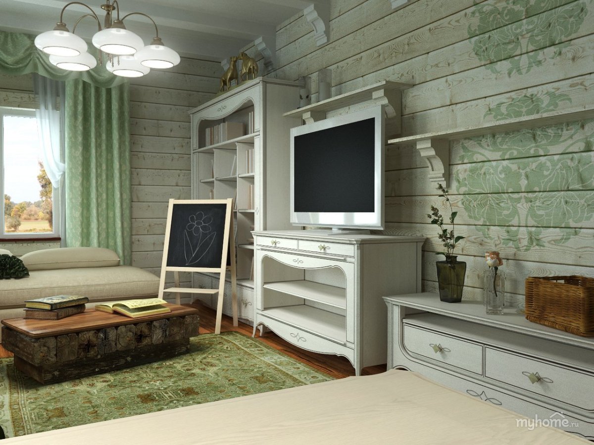 49. Гостиная в стиле Прованс в деревянном доме с обоями