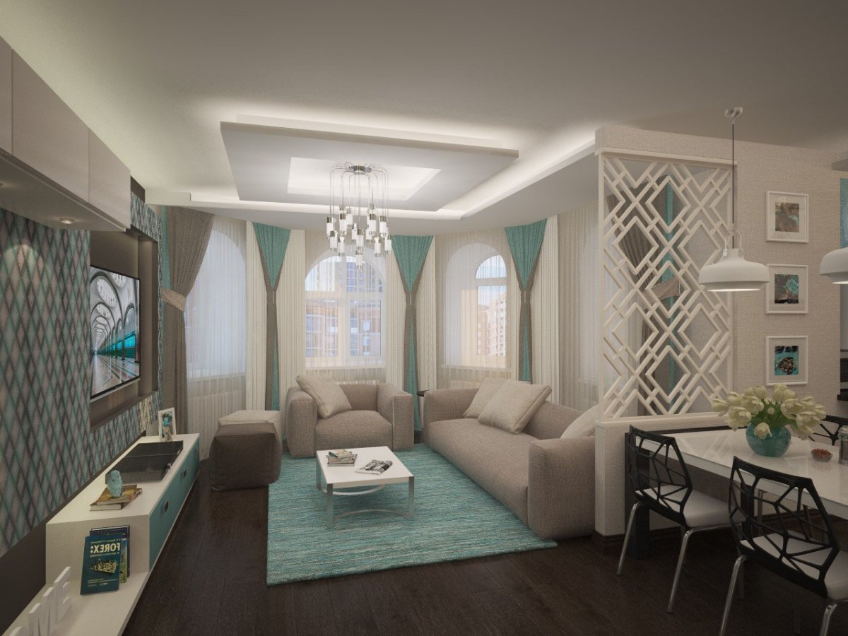 18. Дизайн гостиной с разделением зон синий и зеленый