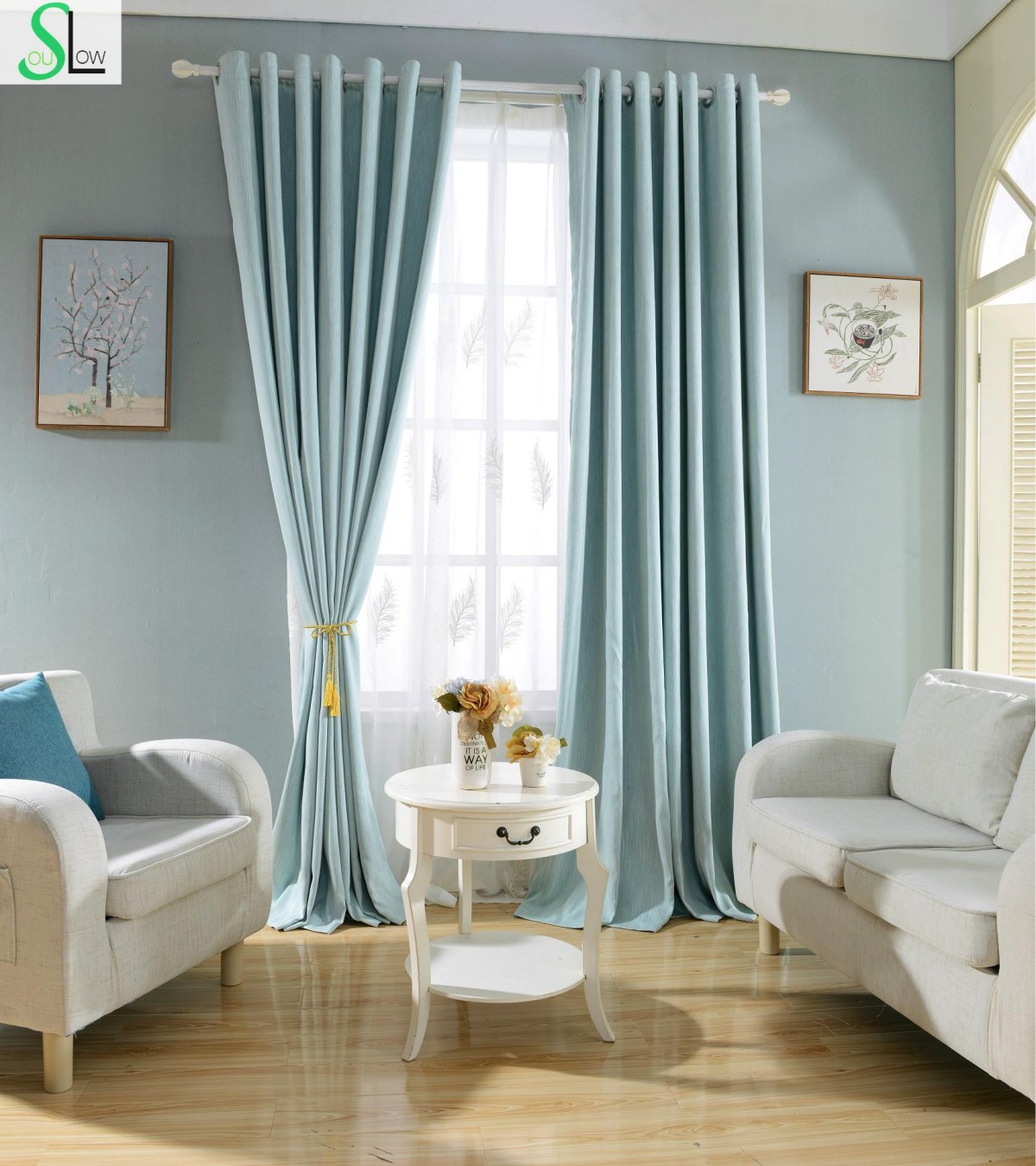 Фото: Гостиная с бирюзовыми шторами
