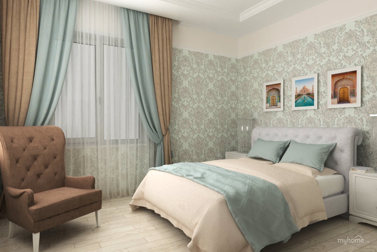 9. Бежевые обои и бирюзовые шторы