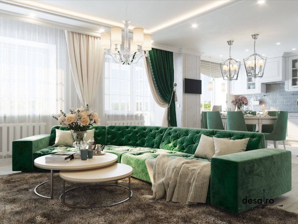 34. Изумрудный цвет в интерьере гостиной