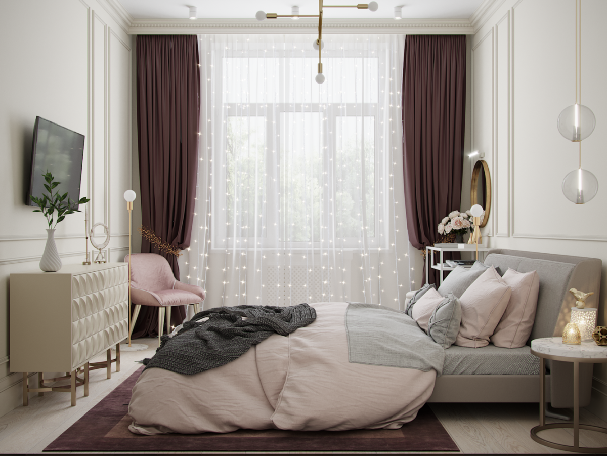13. Пудровые шторы в интерьере спальни