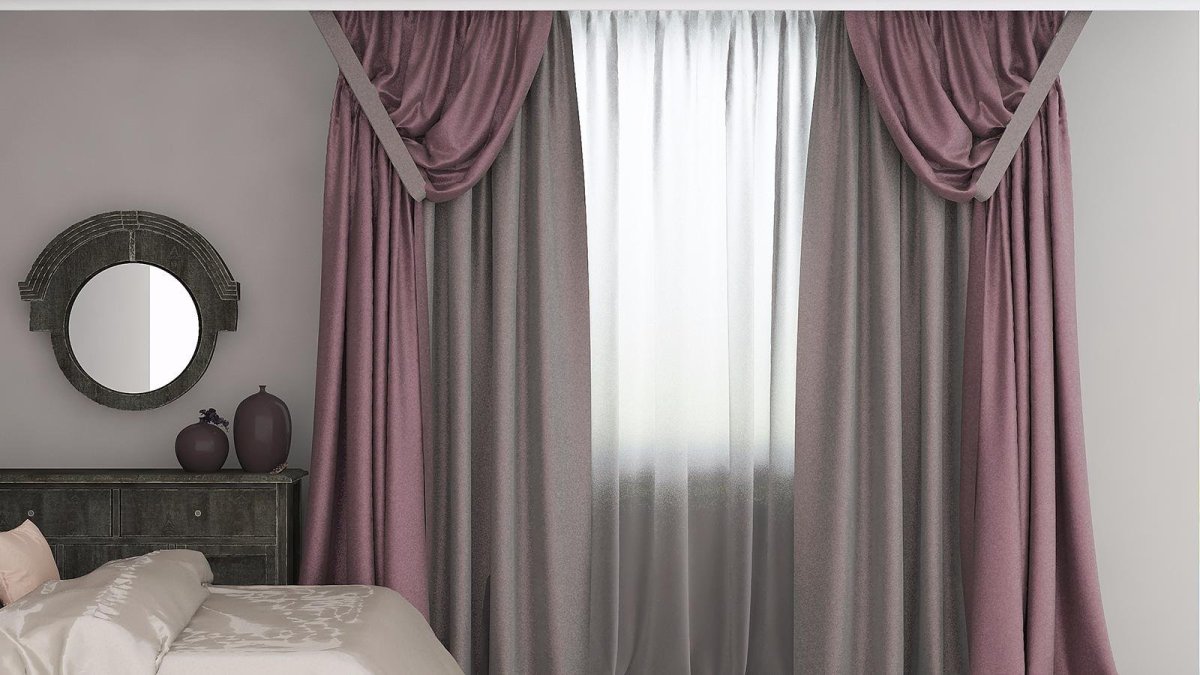44. Серо сиреневые шторы в спальне