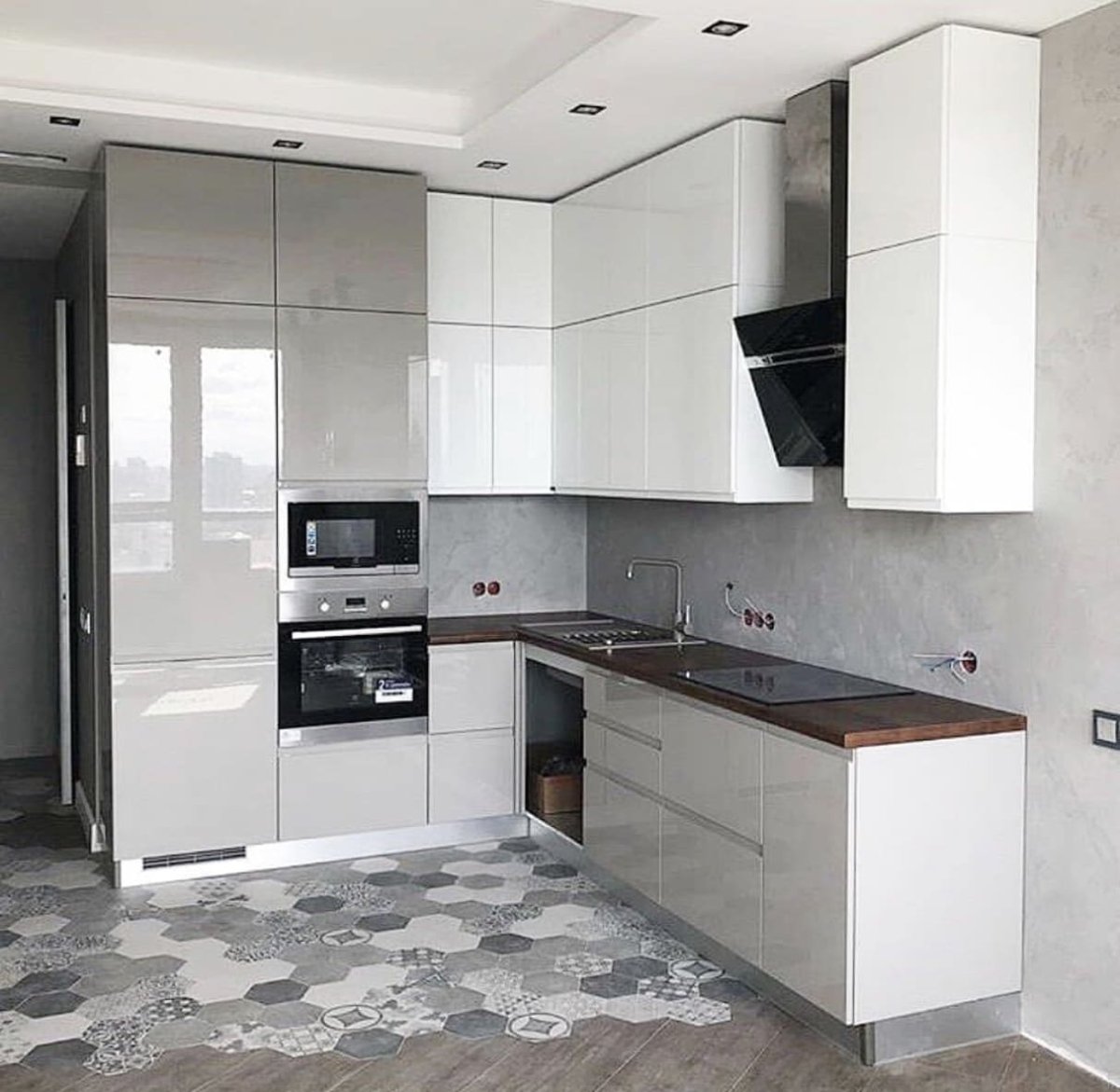 41. Белая глянцевая кухня серые стены