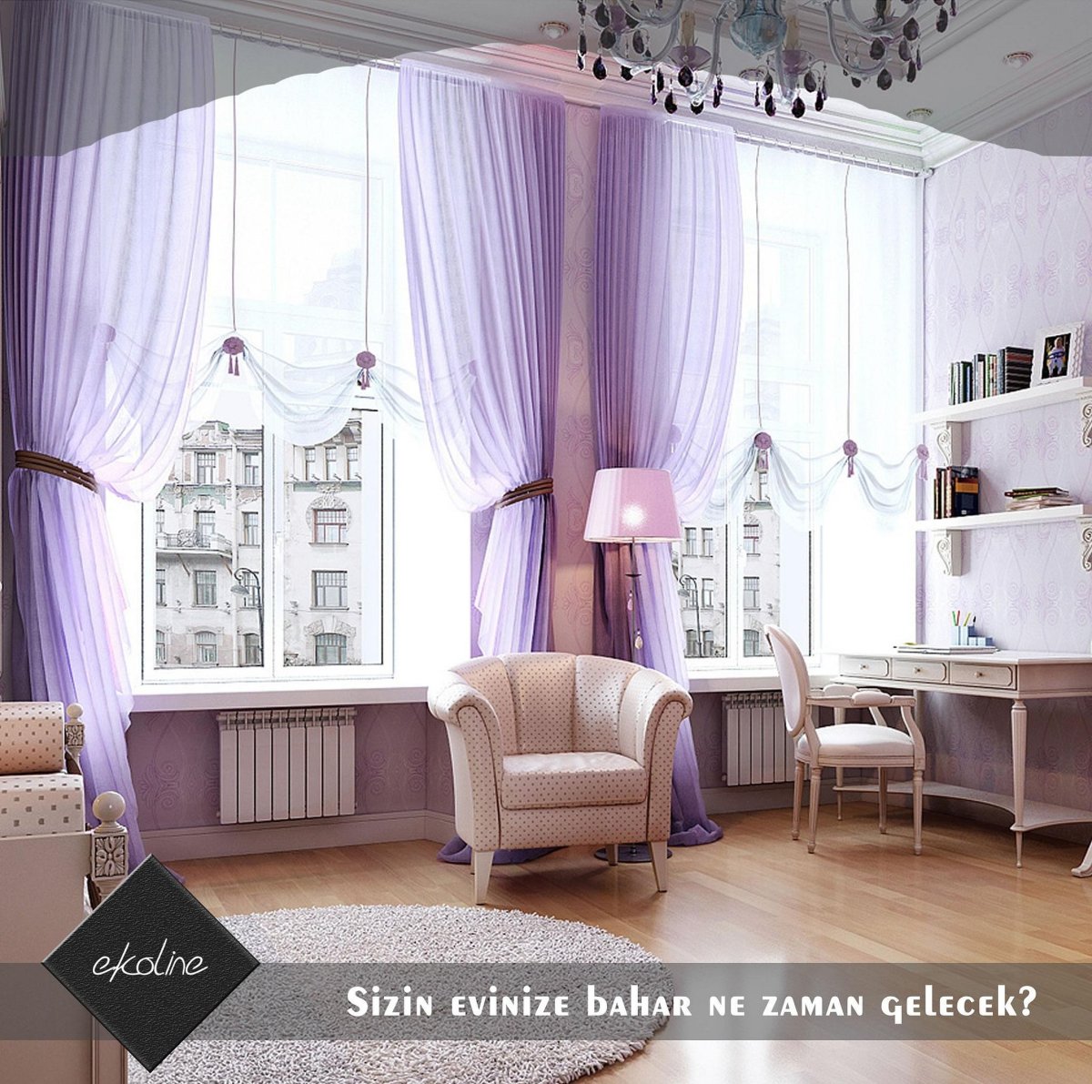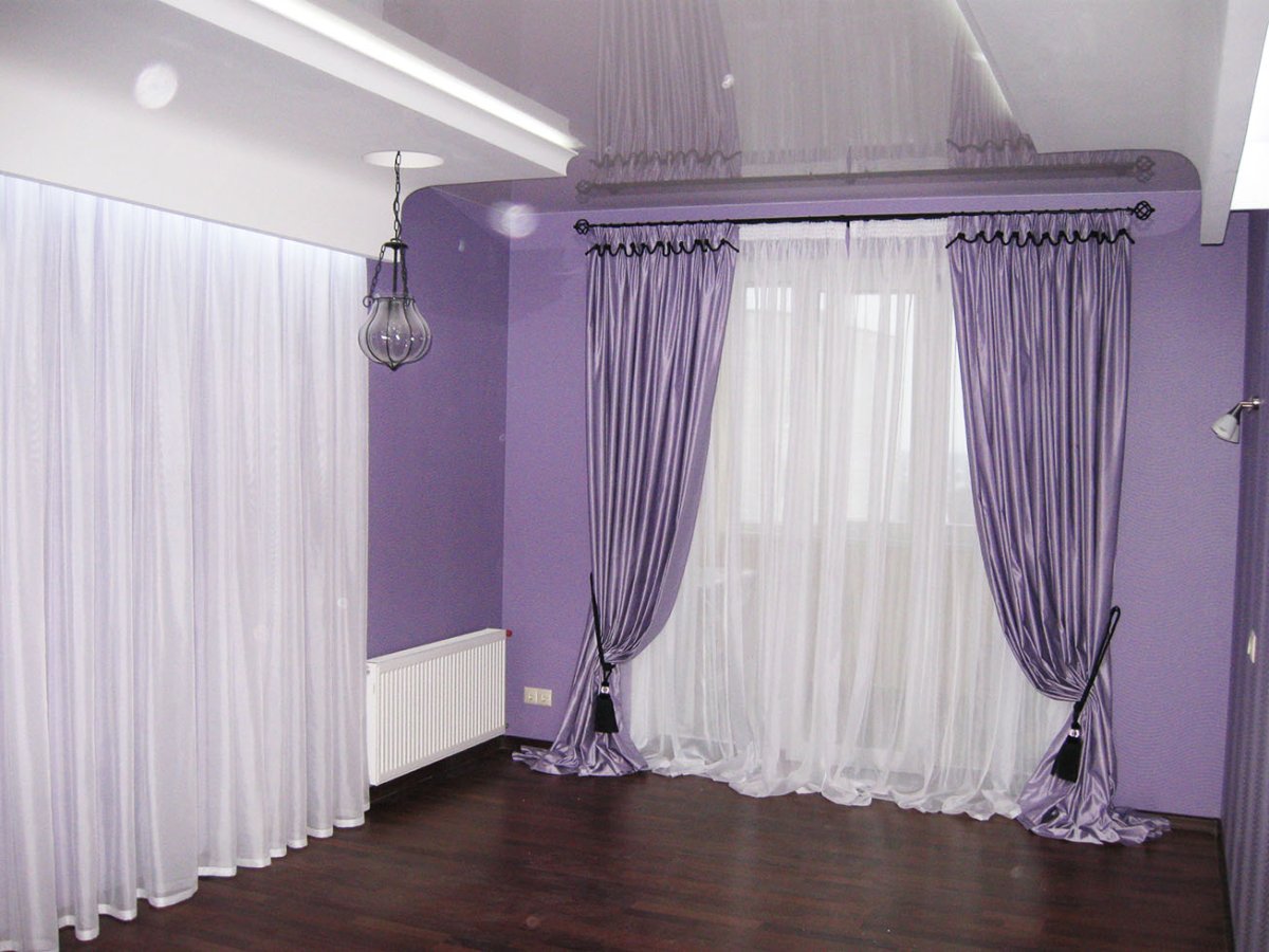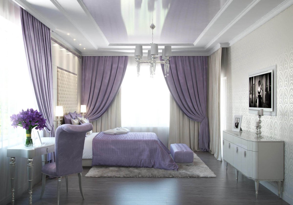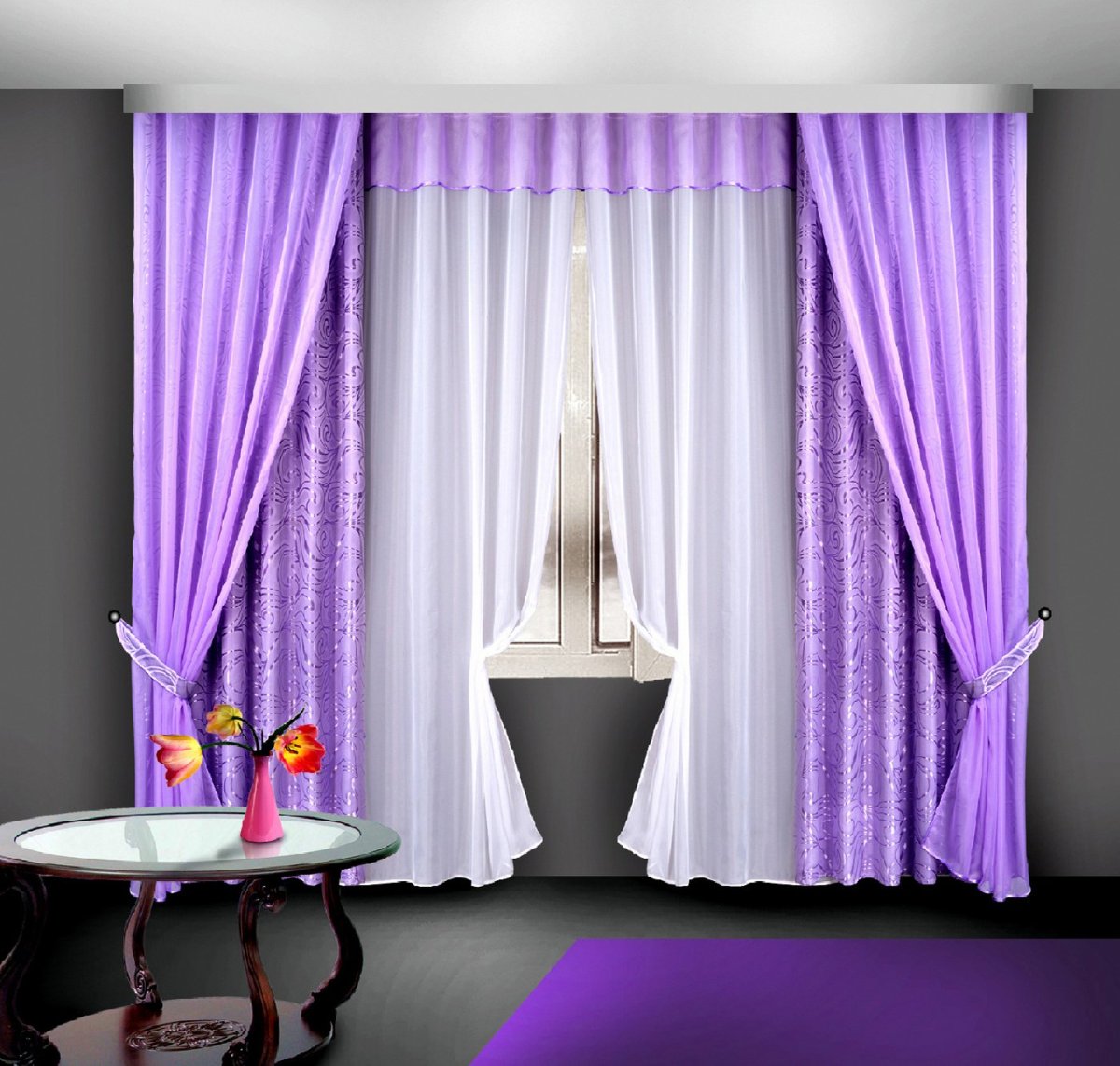 3. Интерьер гостиной в частном доме с фиолетовыми шторами