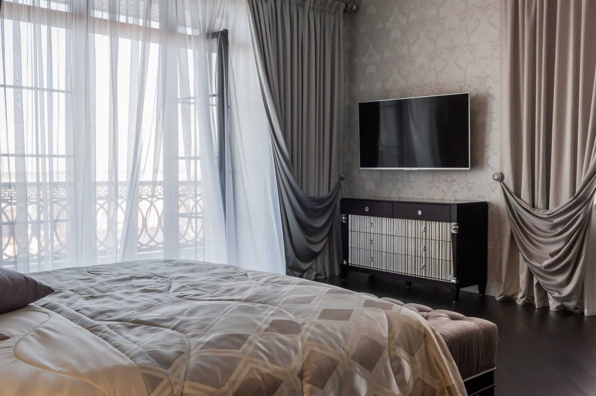 31. Черные шторы в интерьере спальни