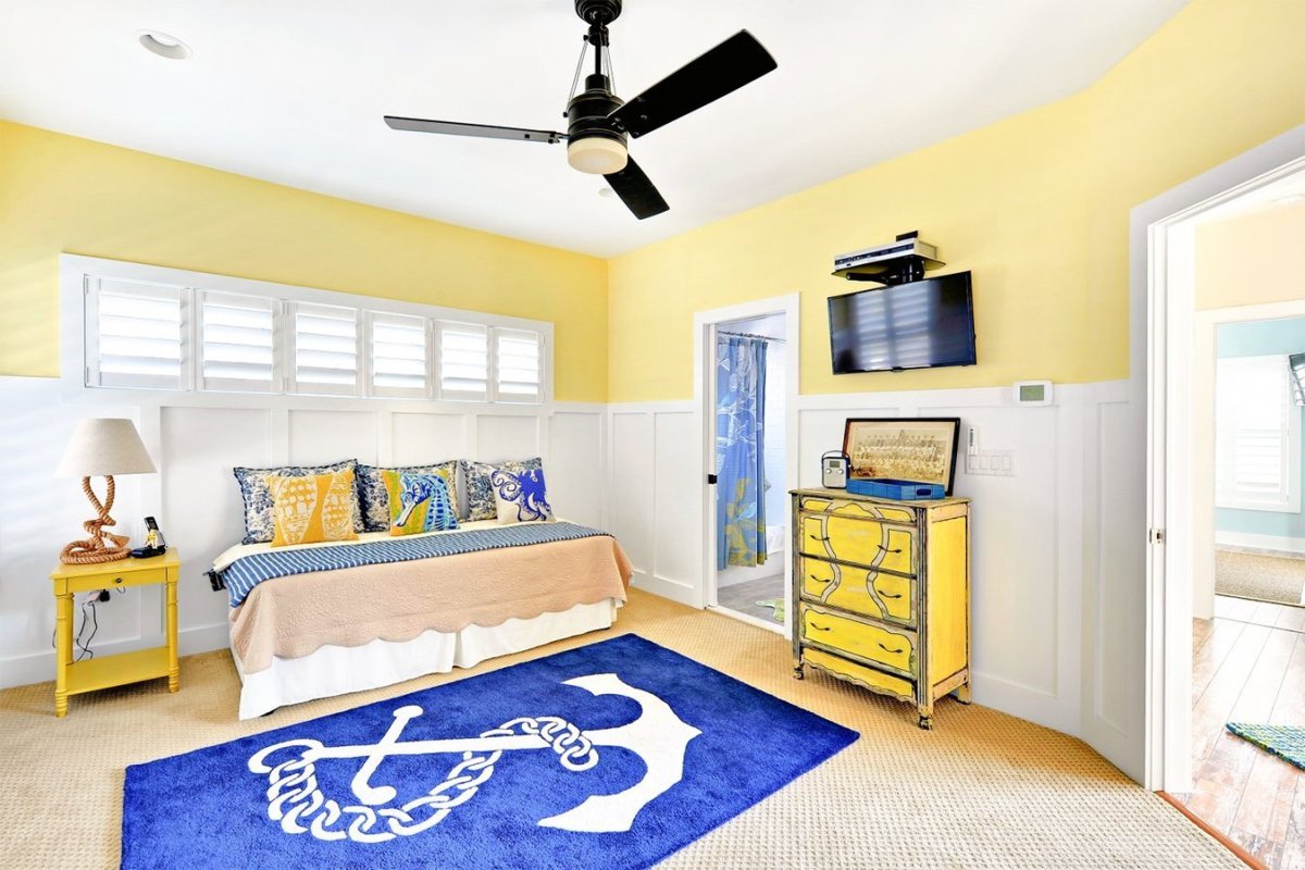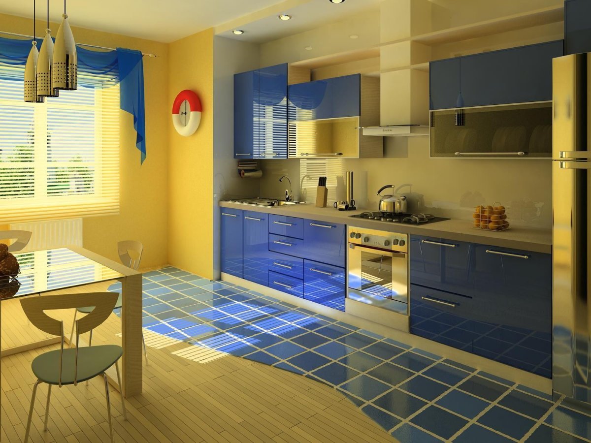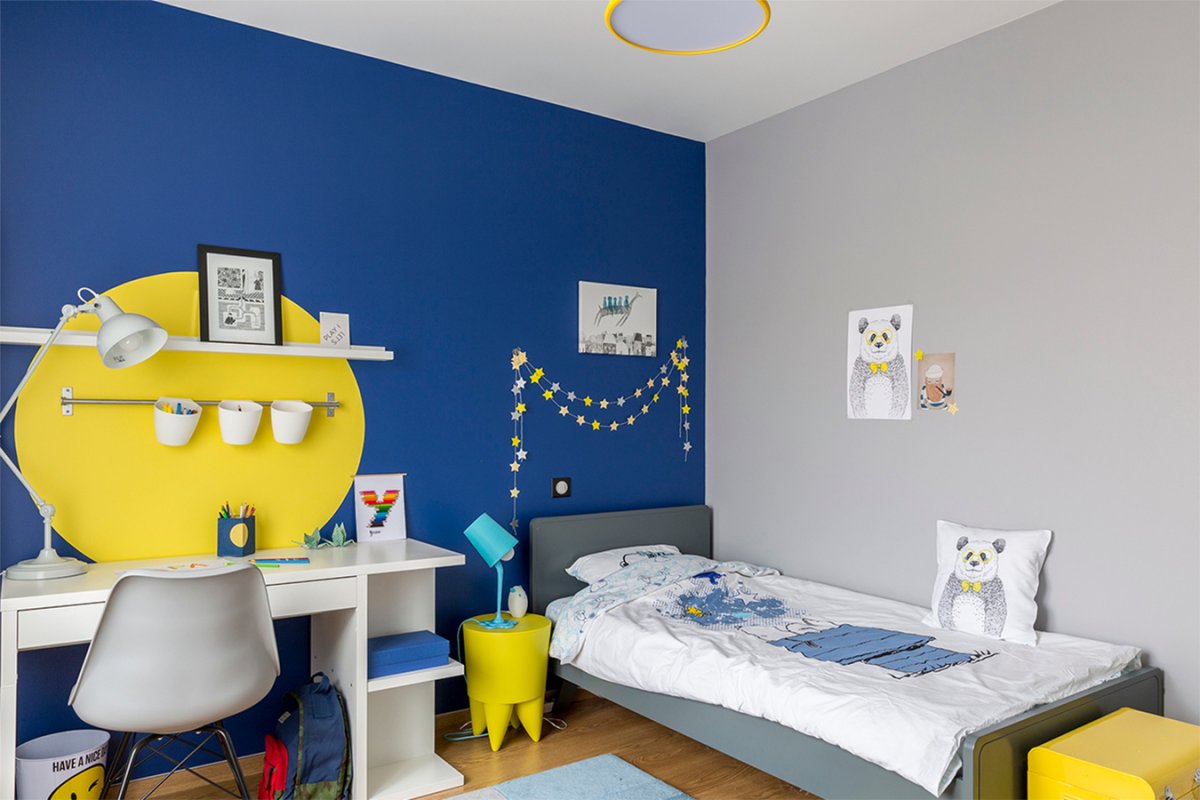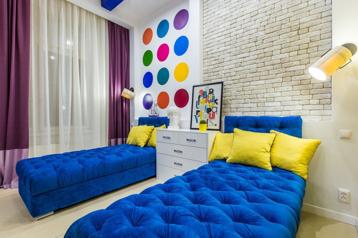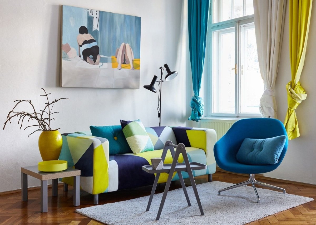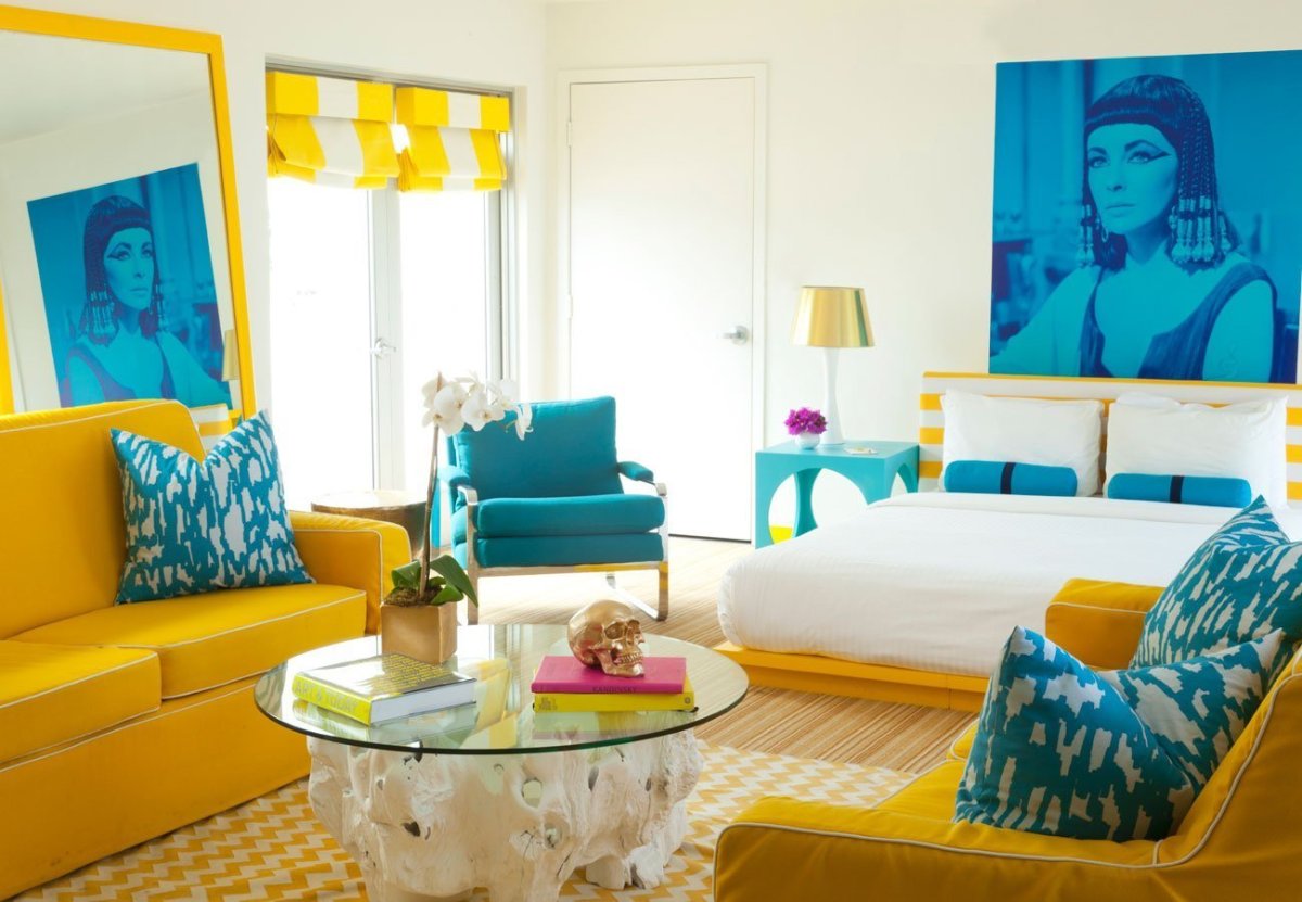9. Дизайн гостиной в желто синих тонах с ТВ зоной