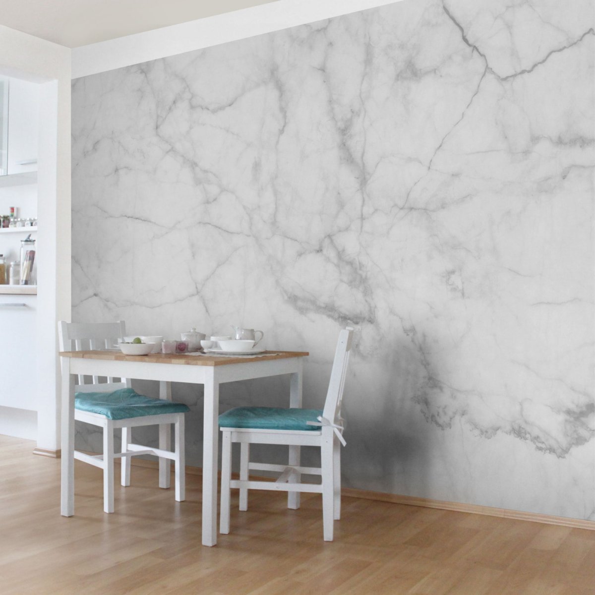 14. Обои под мрамор в интерьере кухни