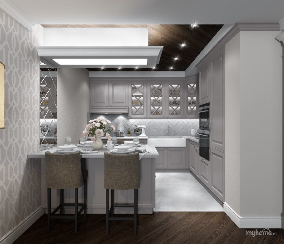 36. П-образная кухня с островом в стиле Неоклассика