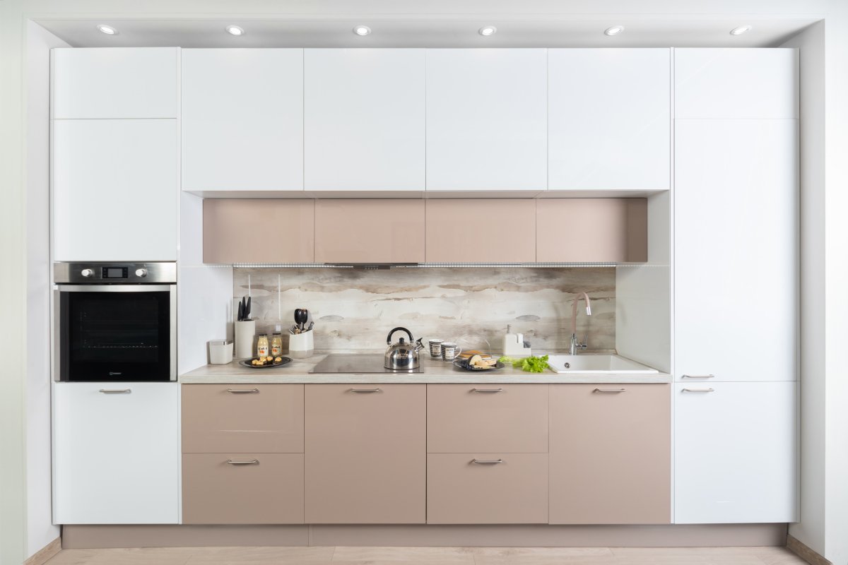 50. Бежевая глянцевая кухня в интерьере