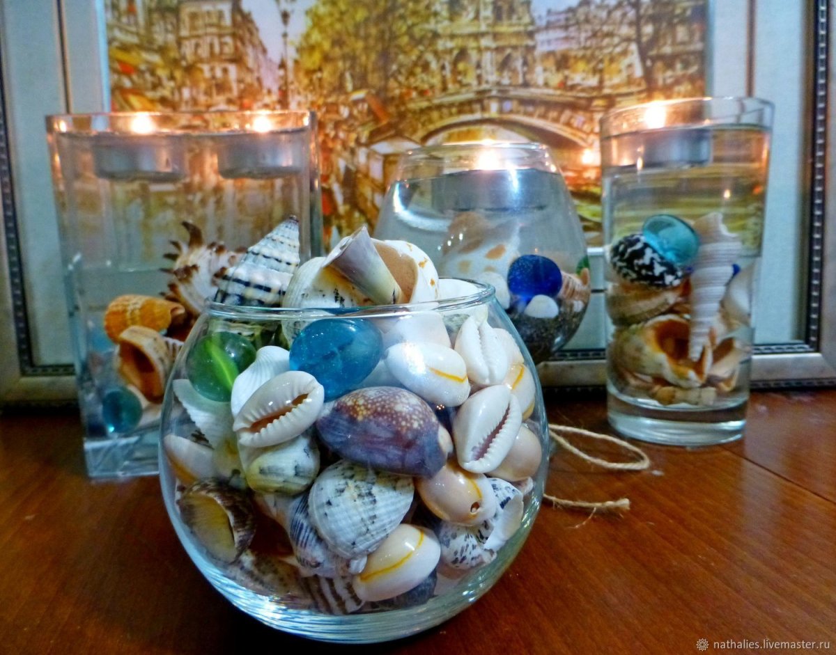 63. Декор с ракушками в стеклянной вазе