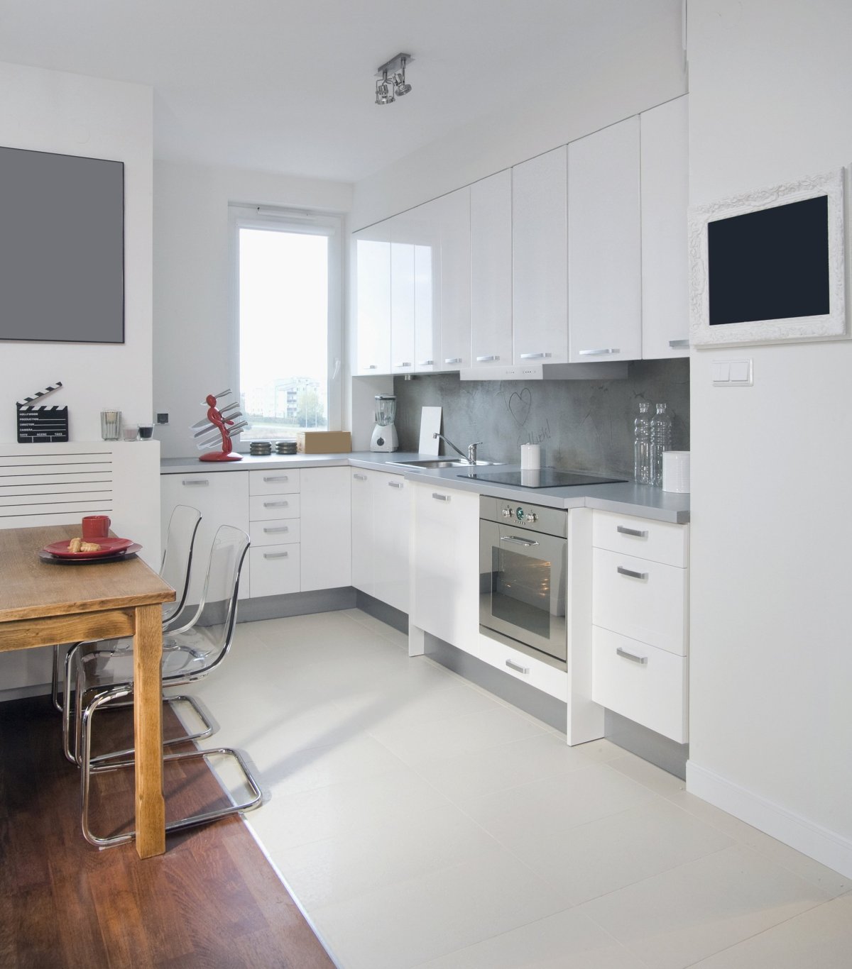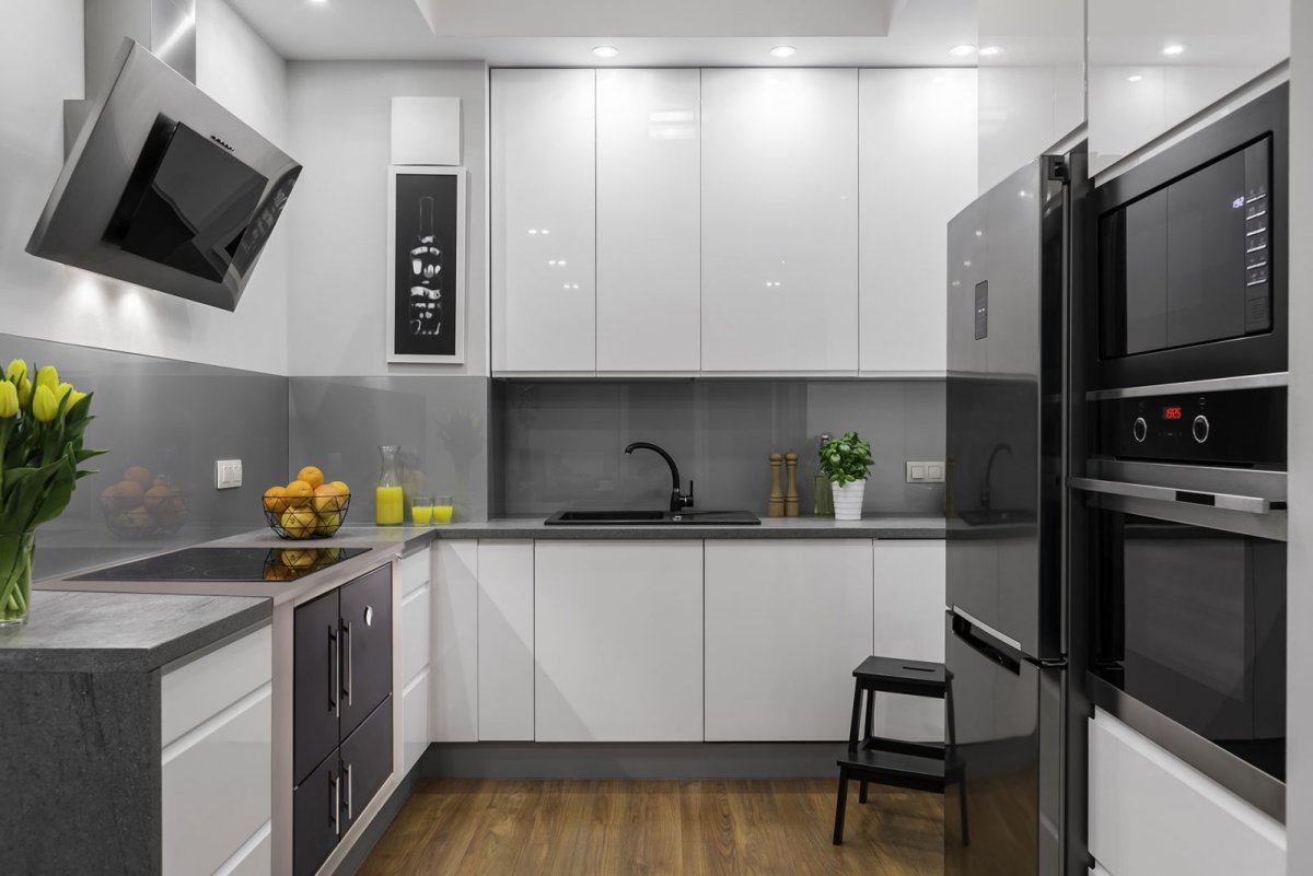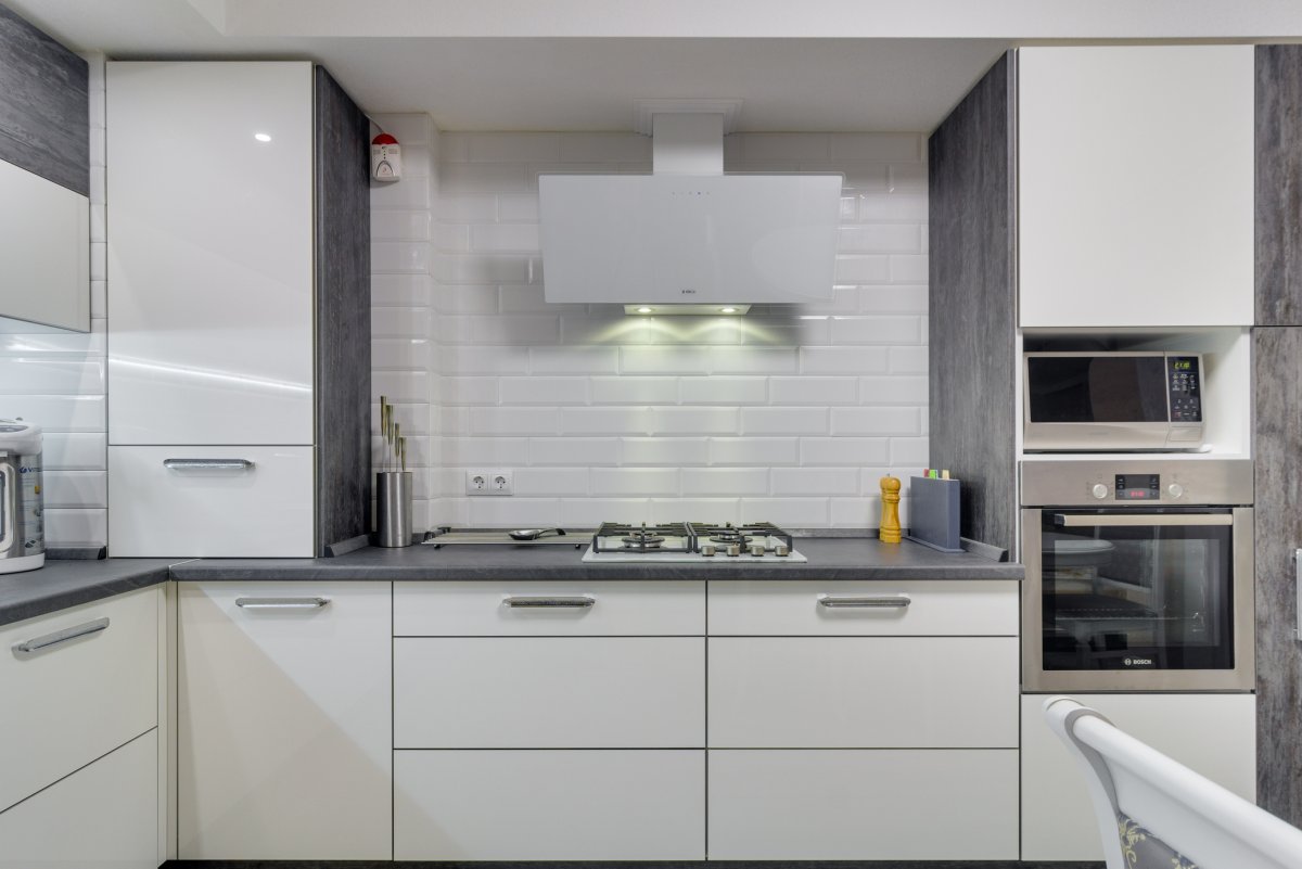 17. Белая кухня с серым фартуком