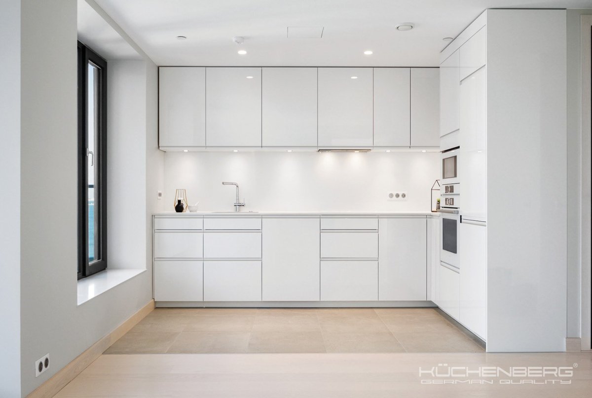26. Белая глянцевая кухня без ручек