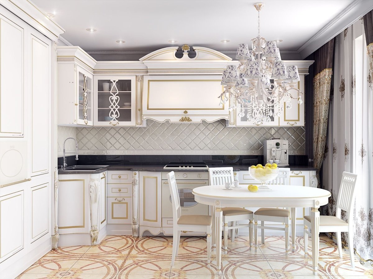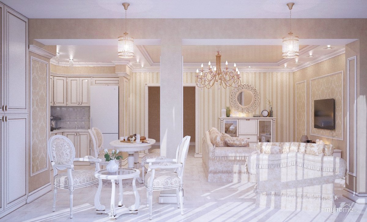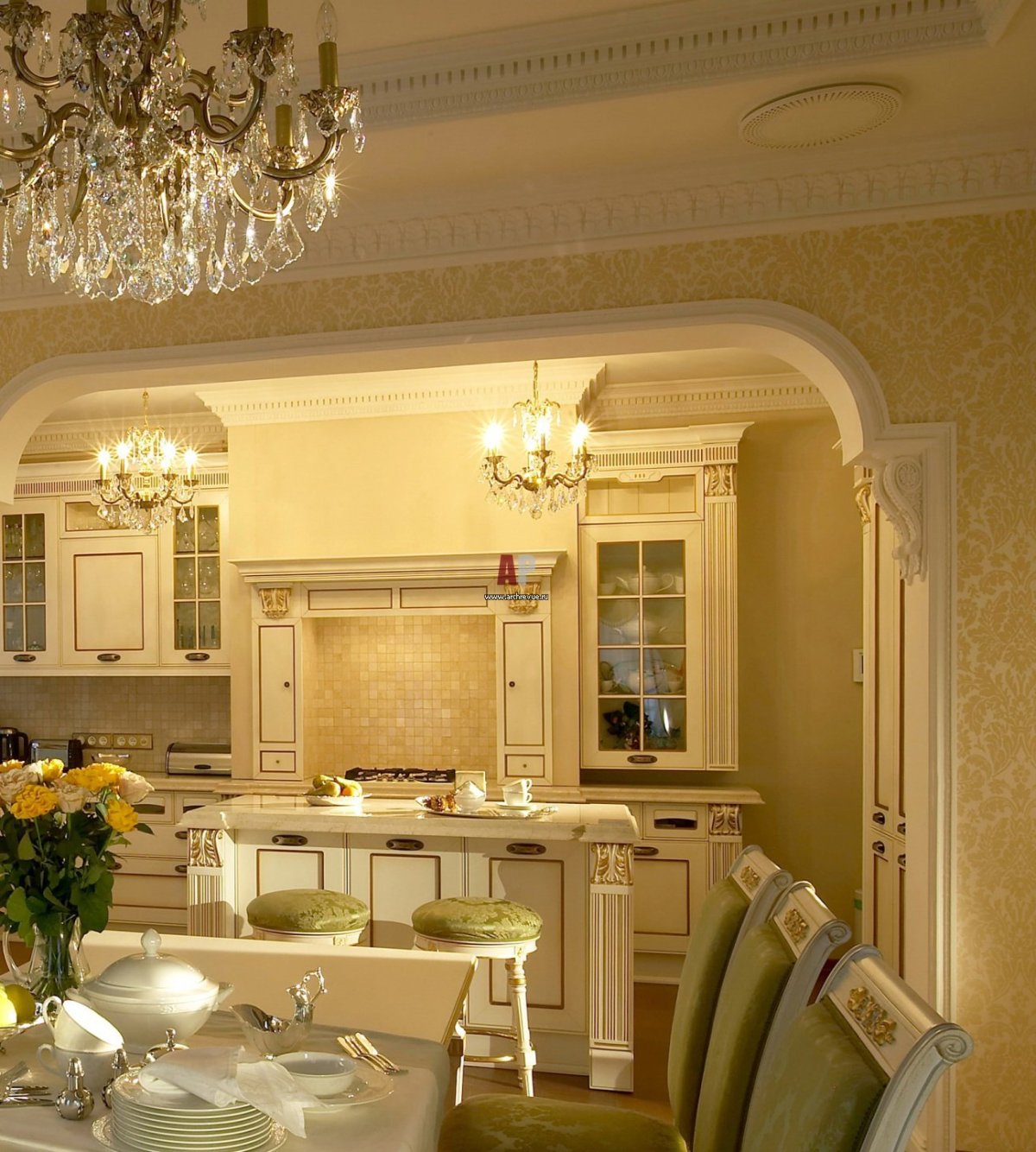 54. Кухня гостиная в классическом стиле в светлых тонах