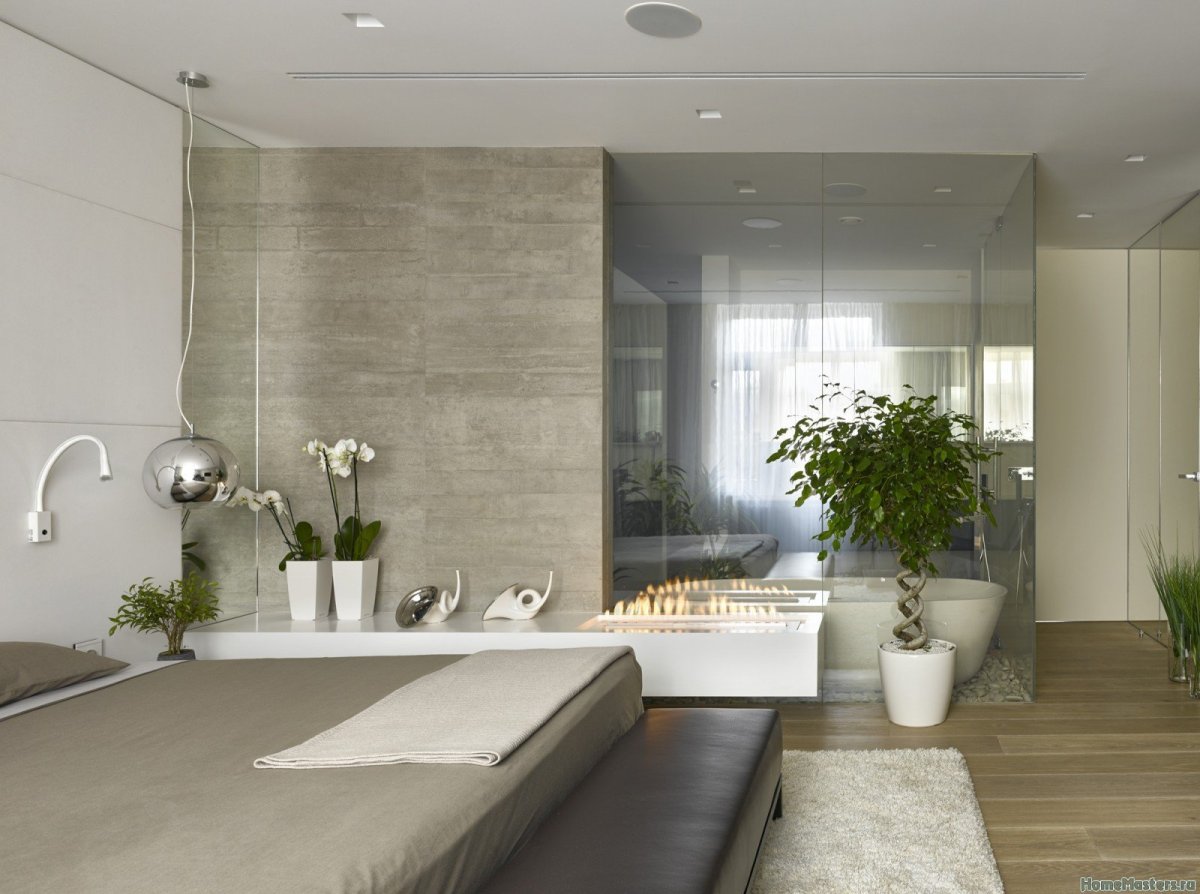 59. Спальня со стеклянной перегородкой в ванной