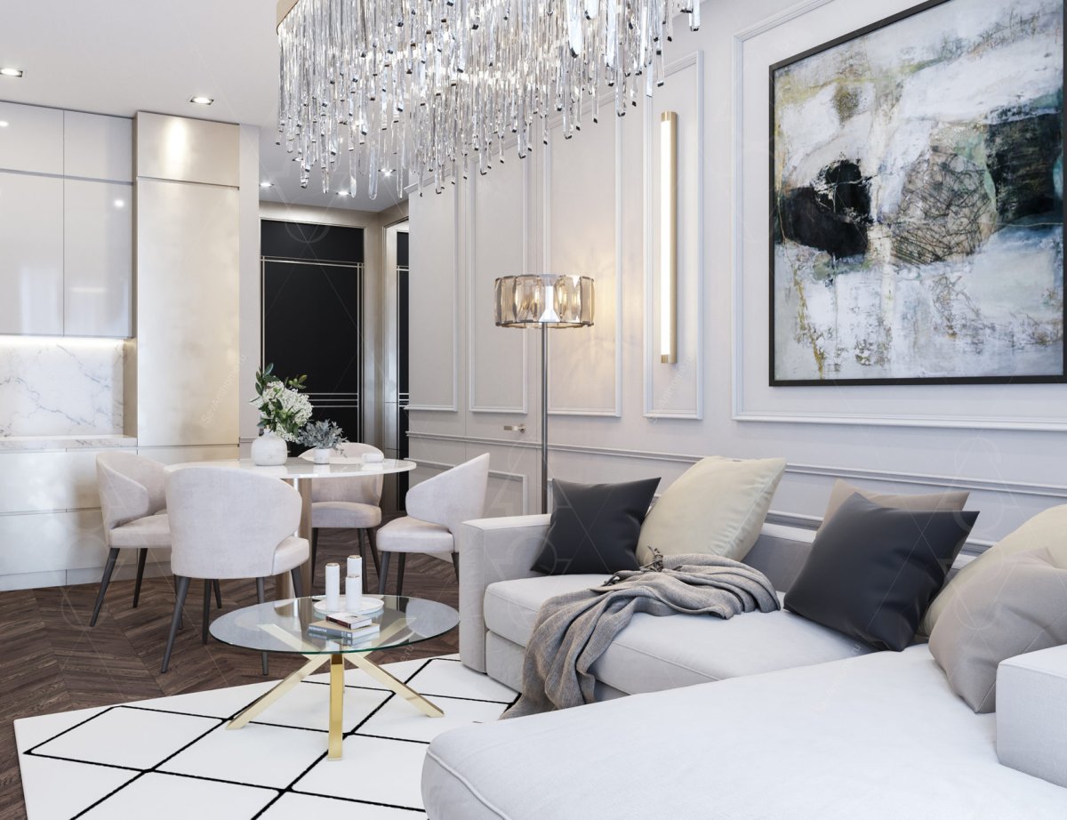 32. Интерьер гостиннтй в сером перламутровом цвете