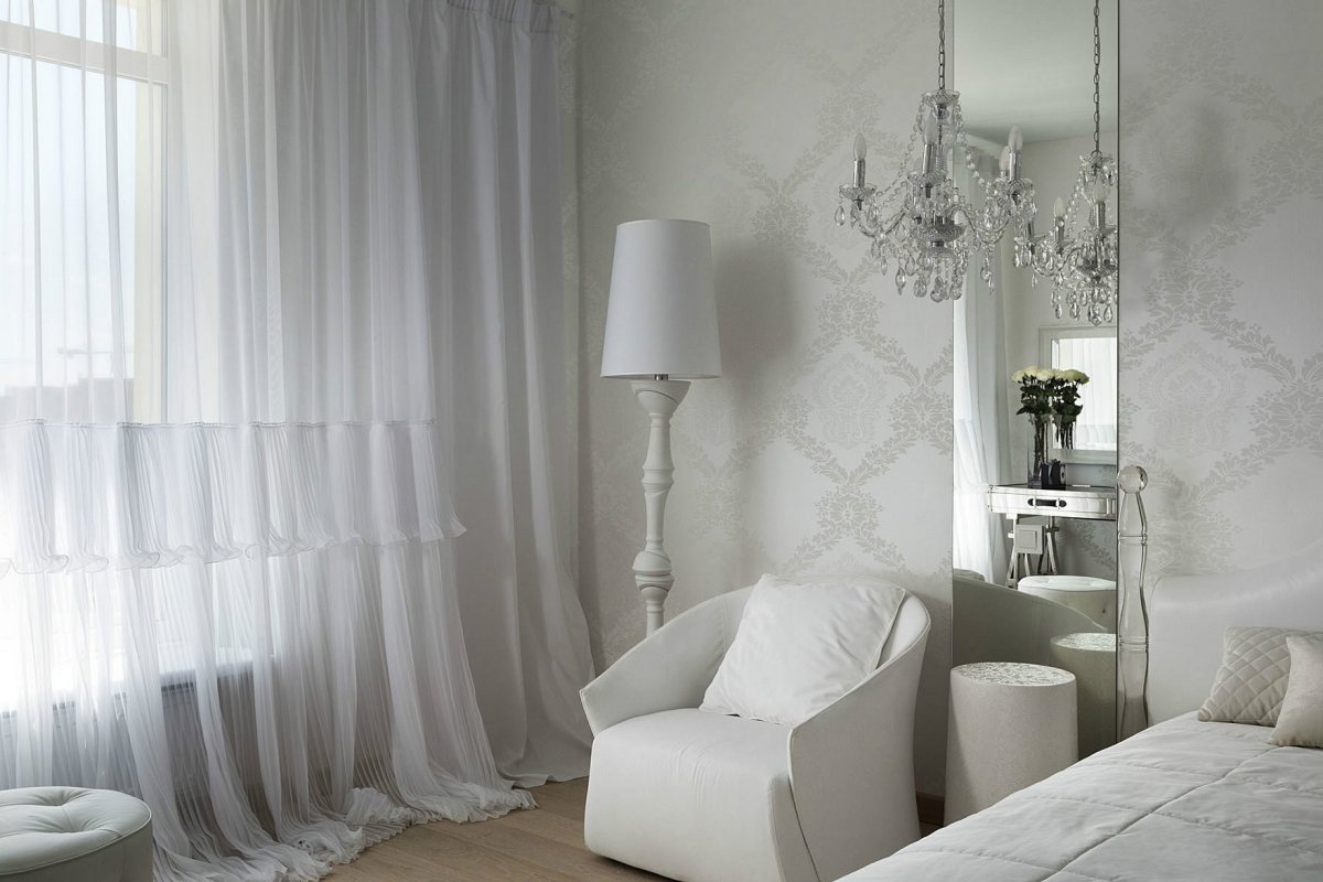 41. Интерьер гостиной с белыми и серебристыми обоями