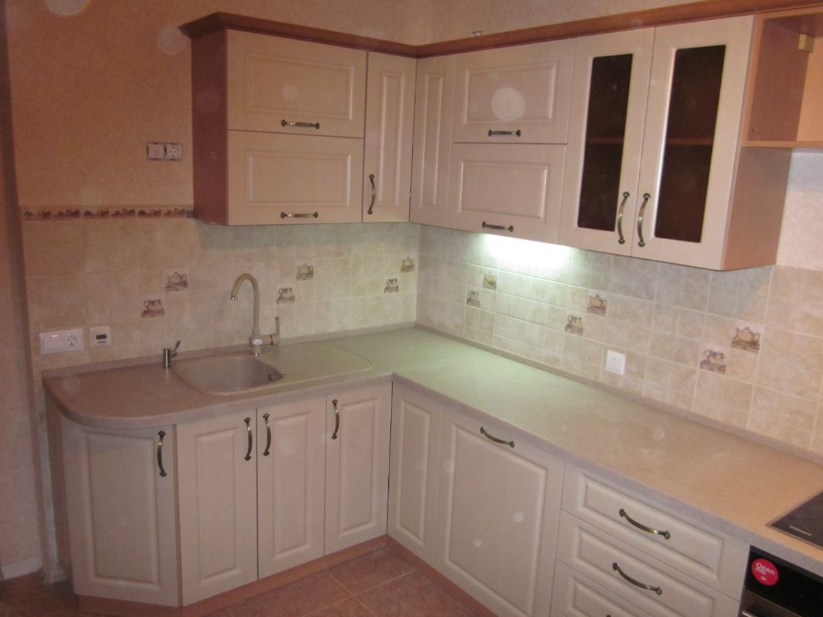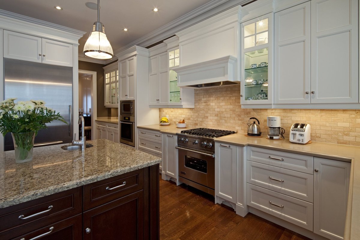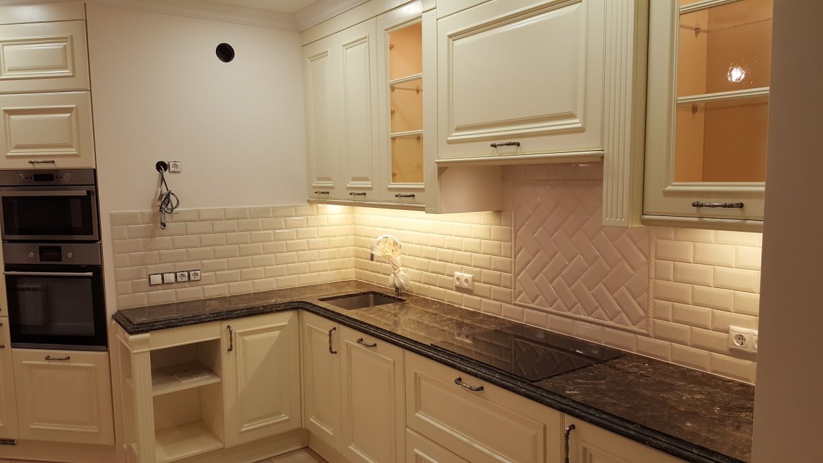 24. Бежевый кухонный гарнитур в неоклассике с белой столешницей