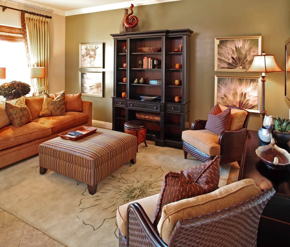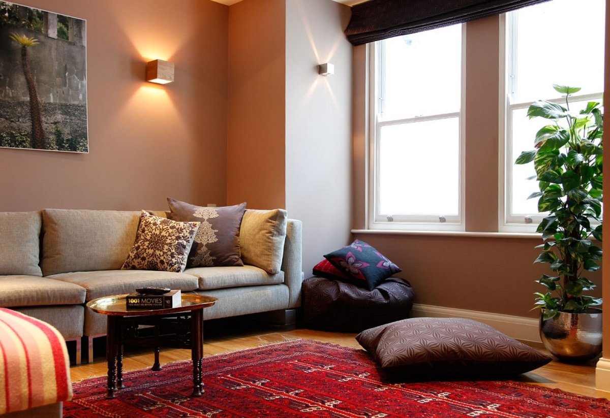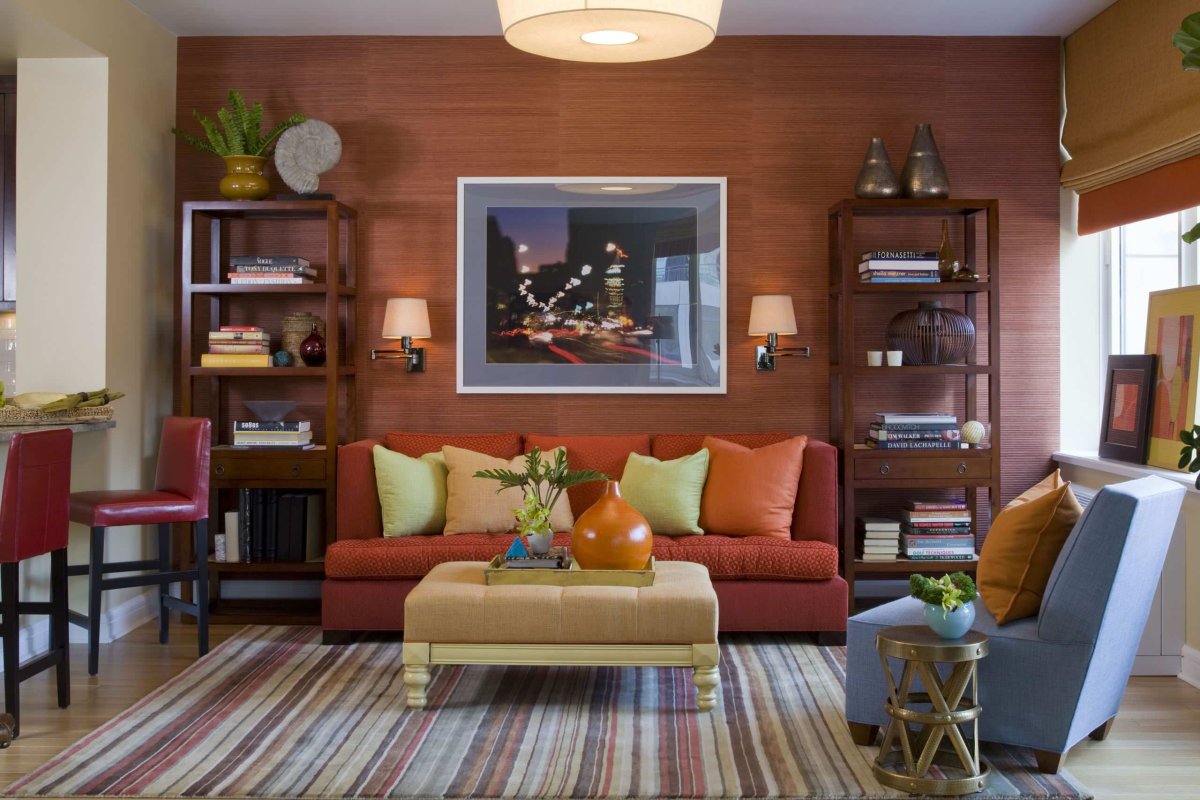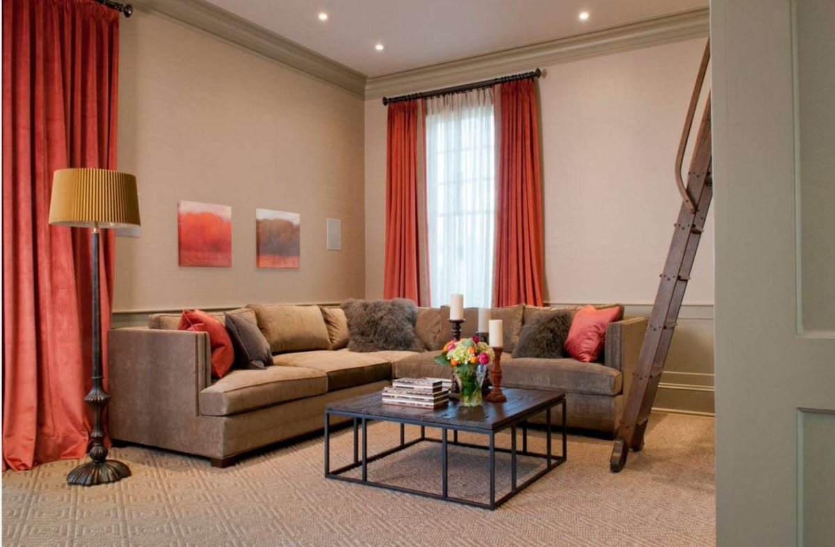 54. Терракотовый приглушенный диван в скандинавском интерьере гостиной
