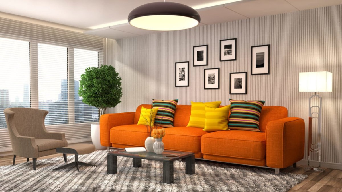 59. Тумба ТВ дизайн интерьера с оранжевым диваном