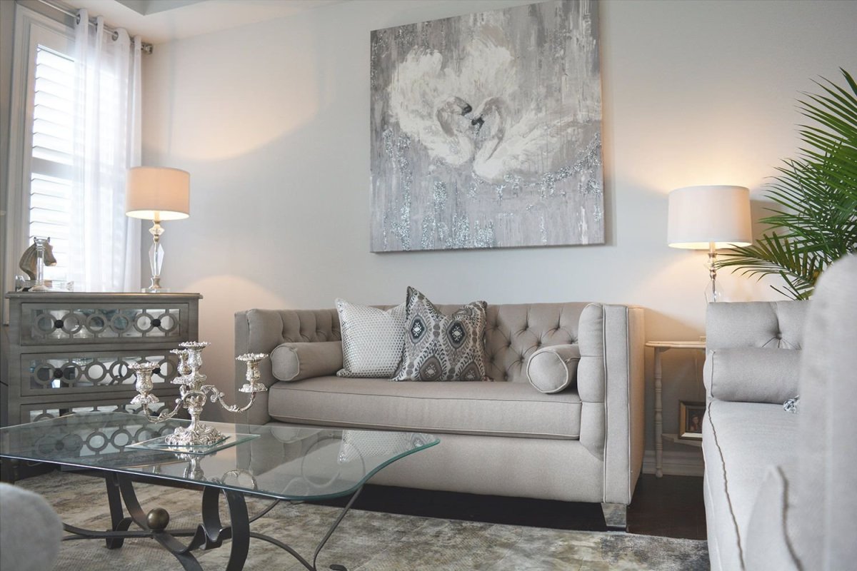 26. Интерьер гостиннтй в сером перламутровом цвете