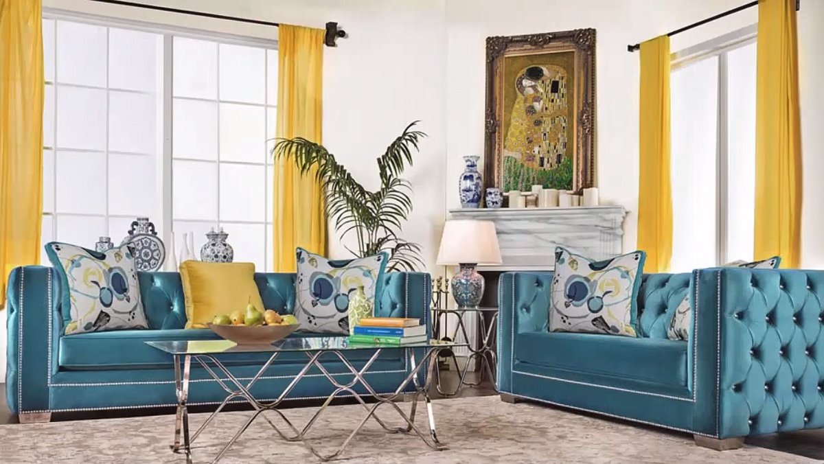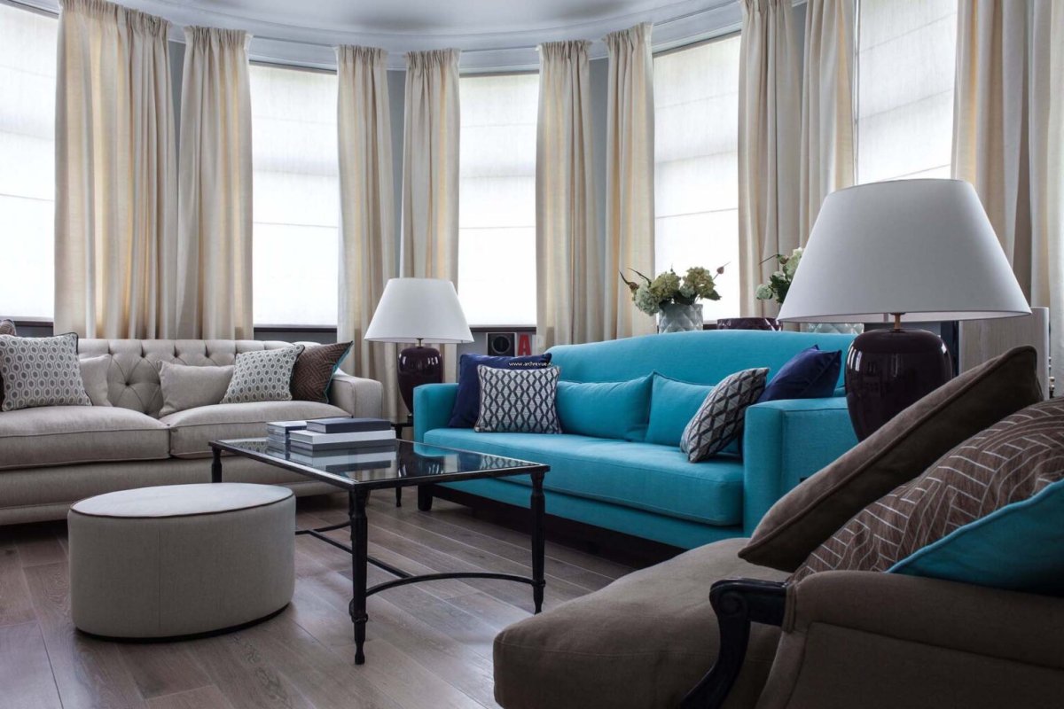 43. Бирюзовый диван и шторы в интерьере