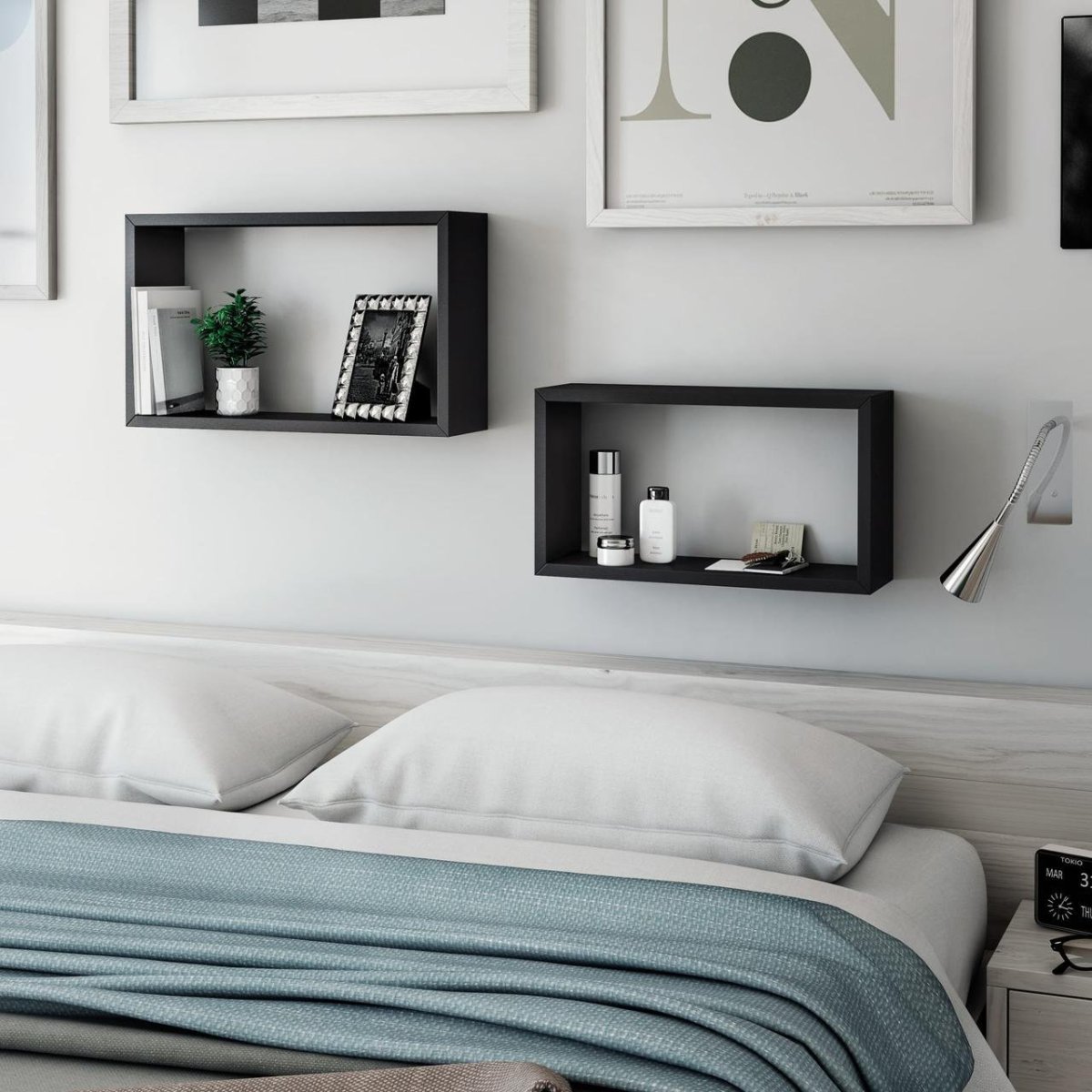 32. Полка со светильником над кроватью