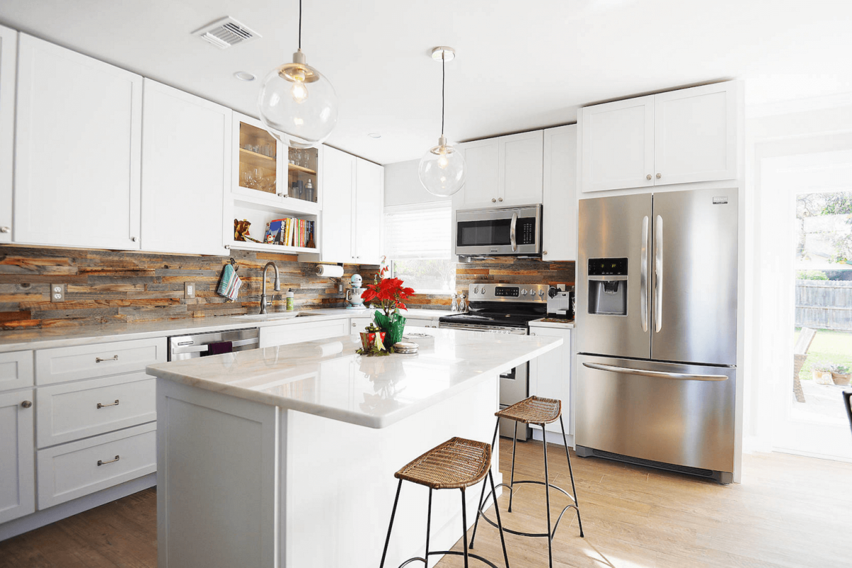 3. Белая кухня с деревянной столешницей