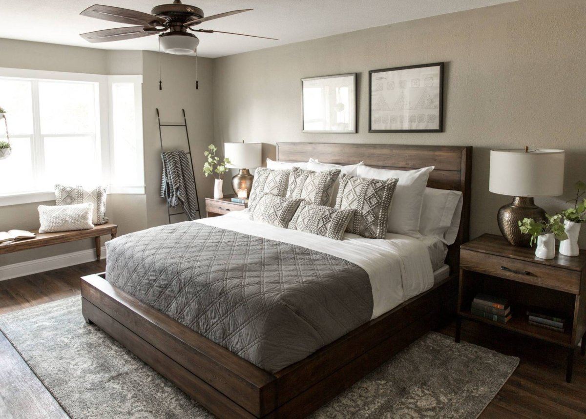 46. Бежевая спальня с темной мебелью
