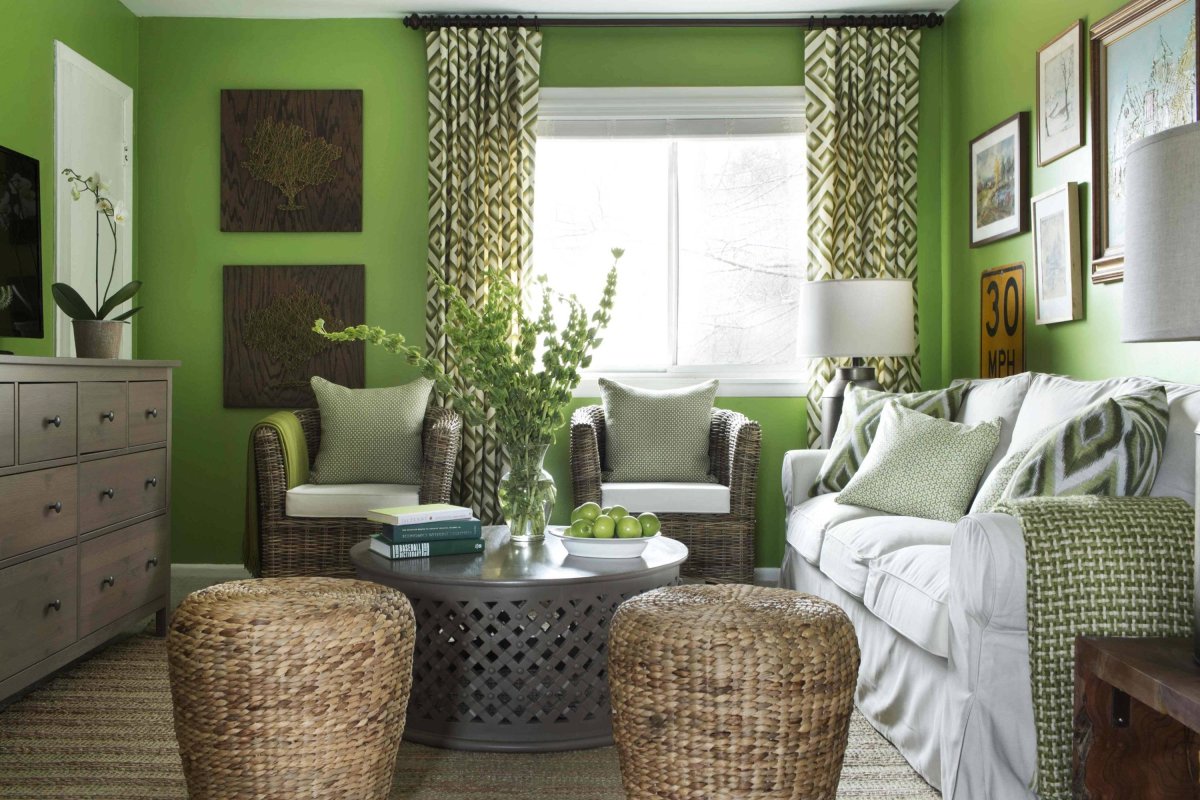 42. Зеленые стены в интерьере гостиной