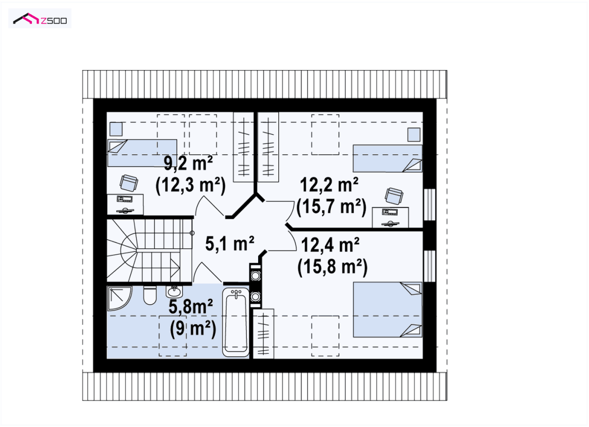 18. Спальни на мансардном этаже с двускатной крышей