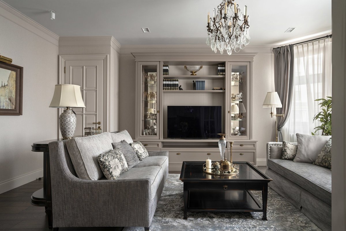 62. Гостиннаяв стиле Неоклассика серая мебель