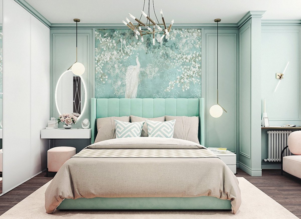 60. Сочетание мятного цвета с другими цветами в интерьере спальни