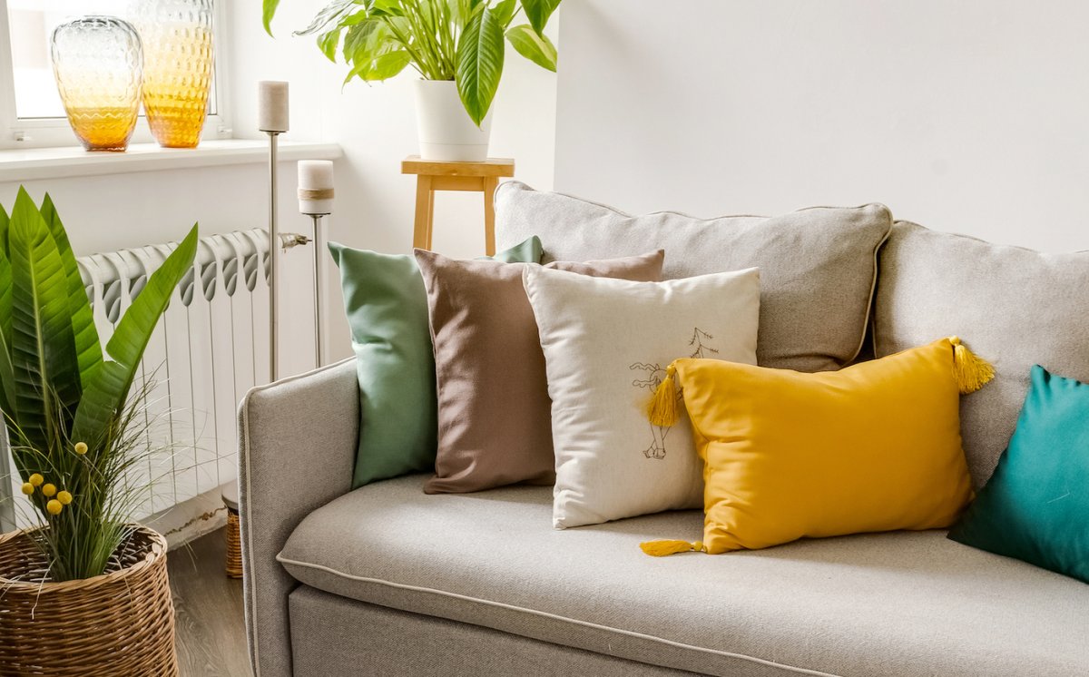 44. Серый диван с цветными подушками