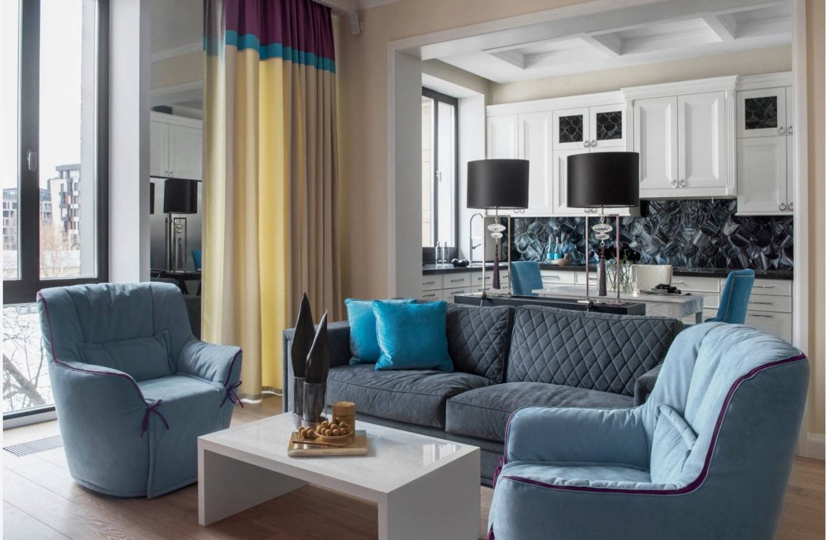 Фото: Синяя кухня гостиная в едином стиле