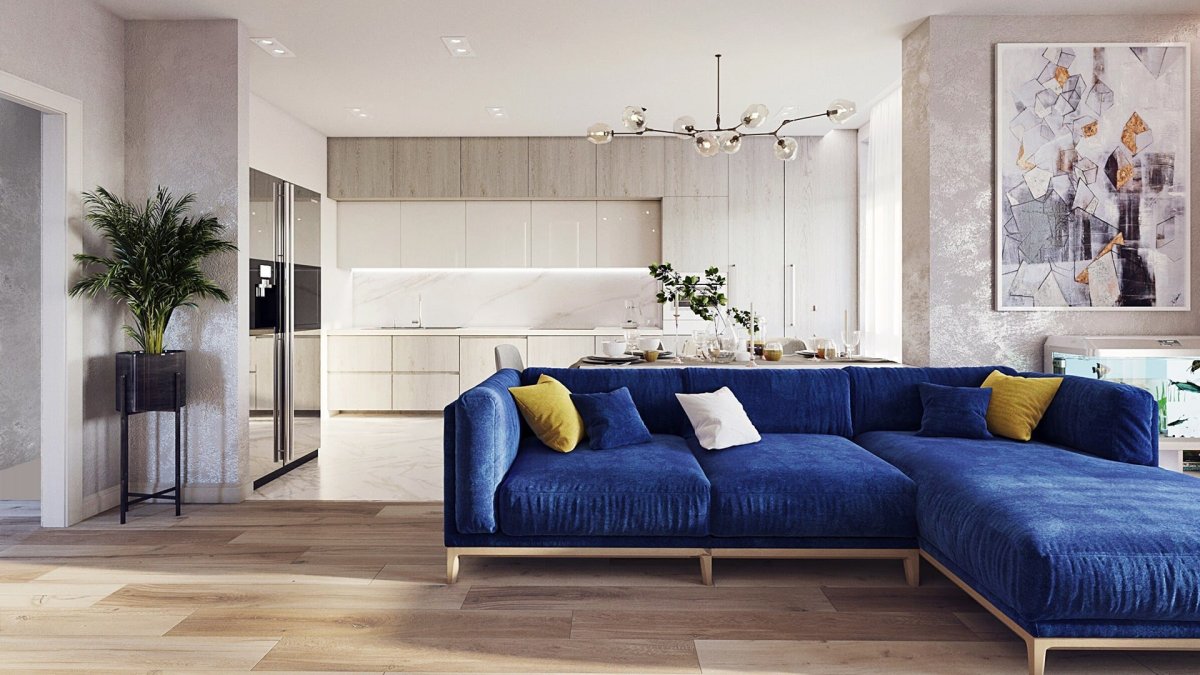10. Современная гостиная с синим диваном