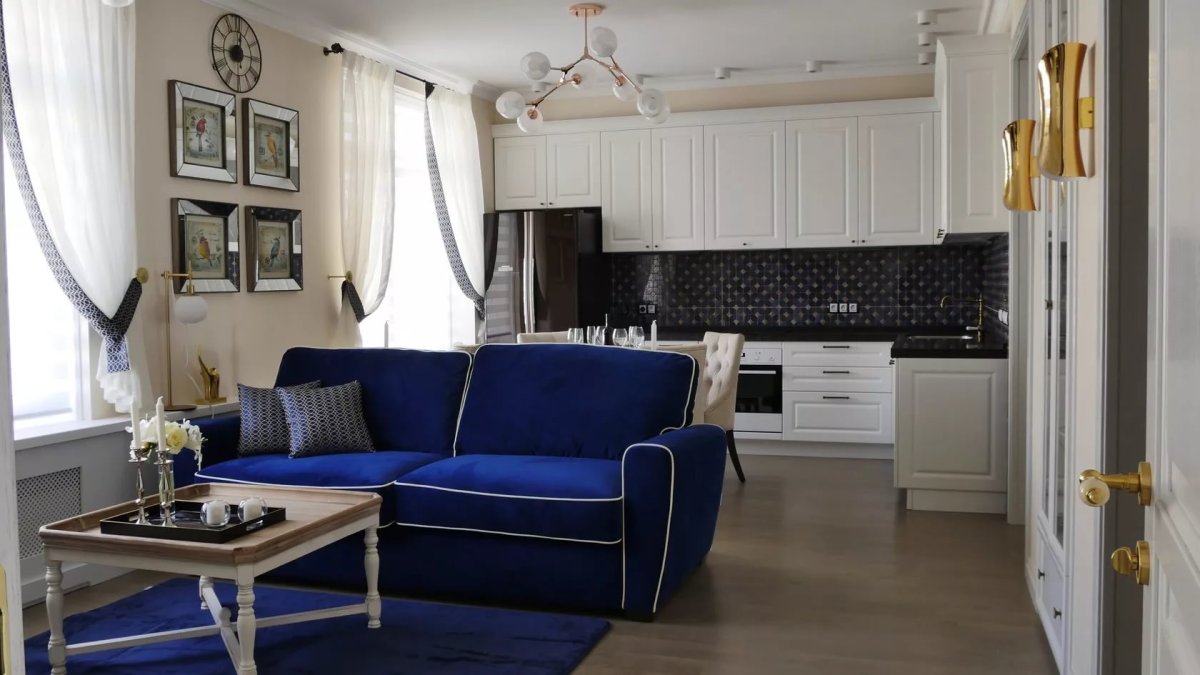41. Кухня гостиная с синим диваном