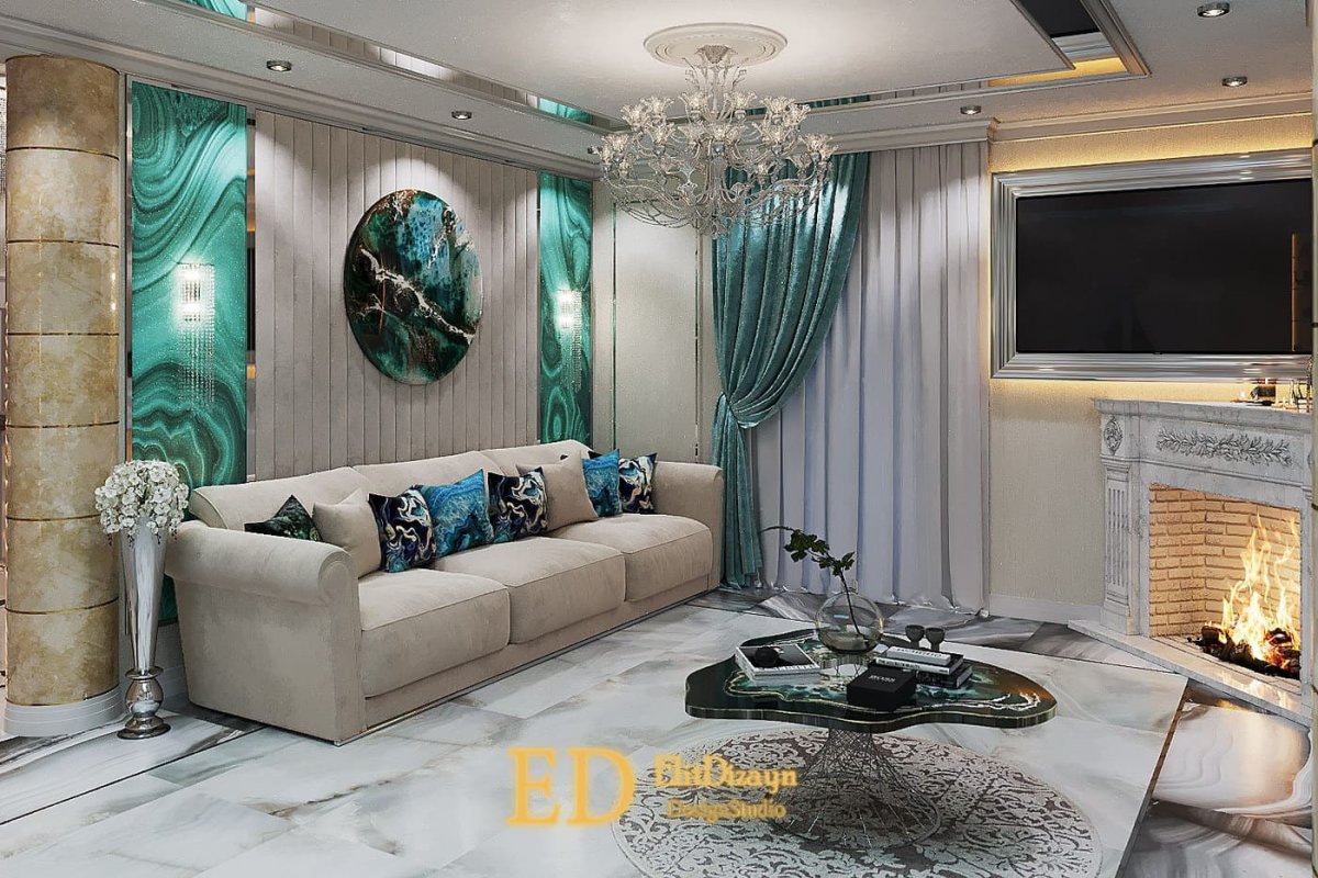33. Камин в бирюзовом интерьере гостиной
