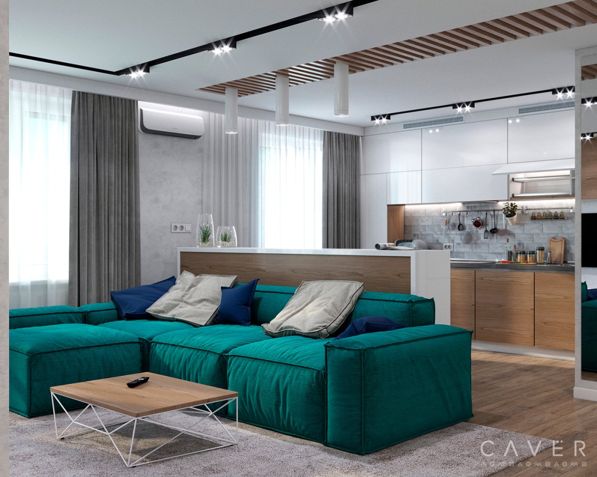 16. Бирюзовый диван в гостиной с деревянной кухне 1