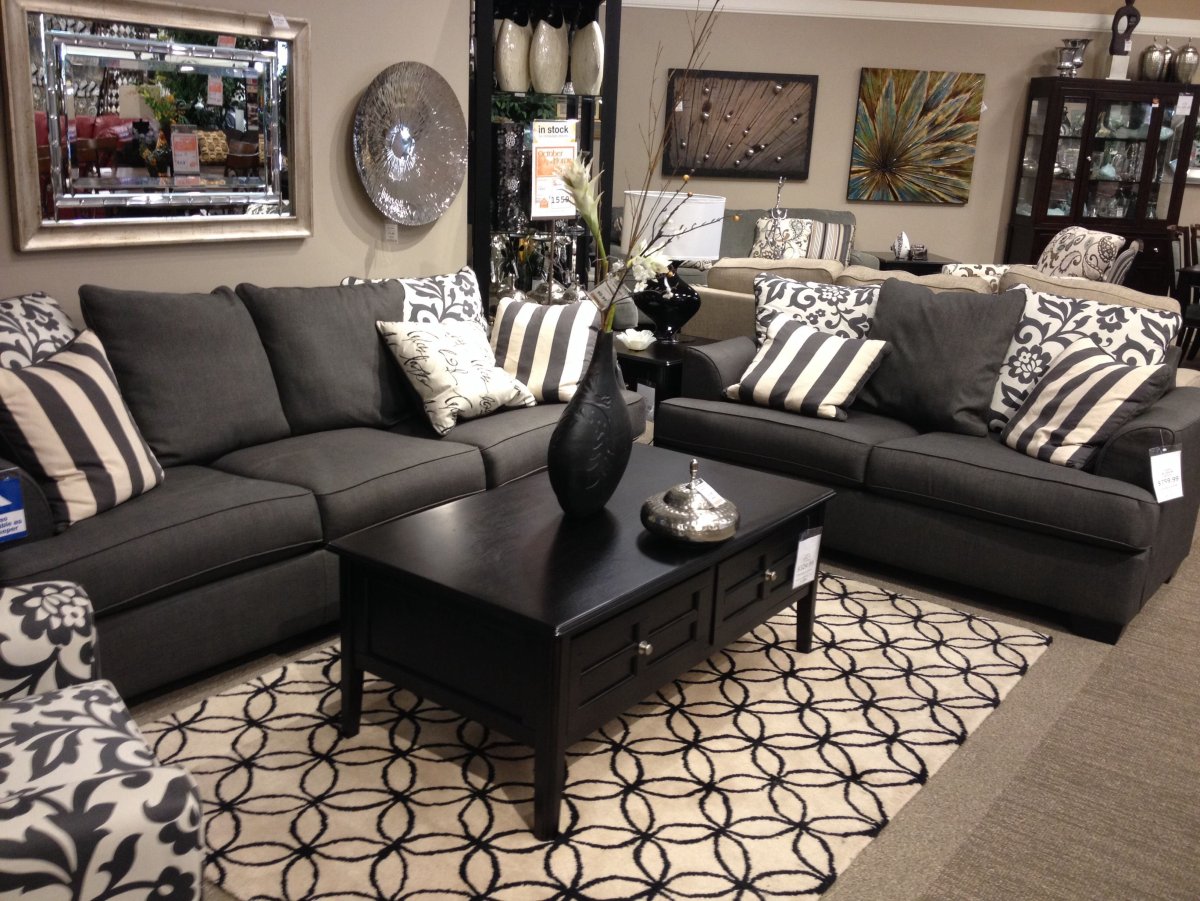 24. Светлая гостиная с темно-серым диваном