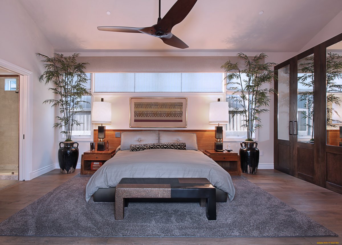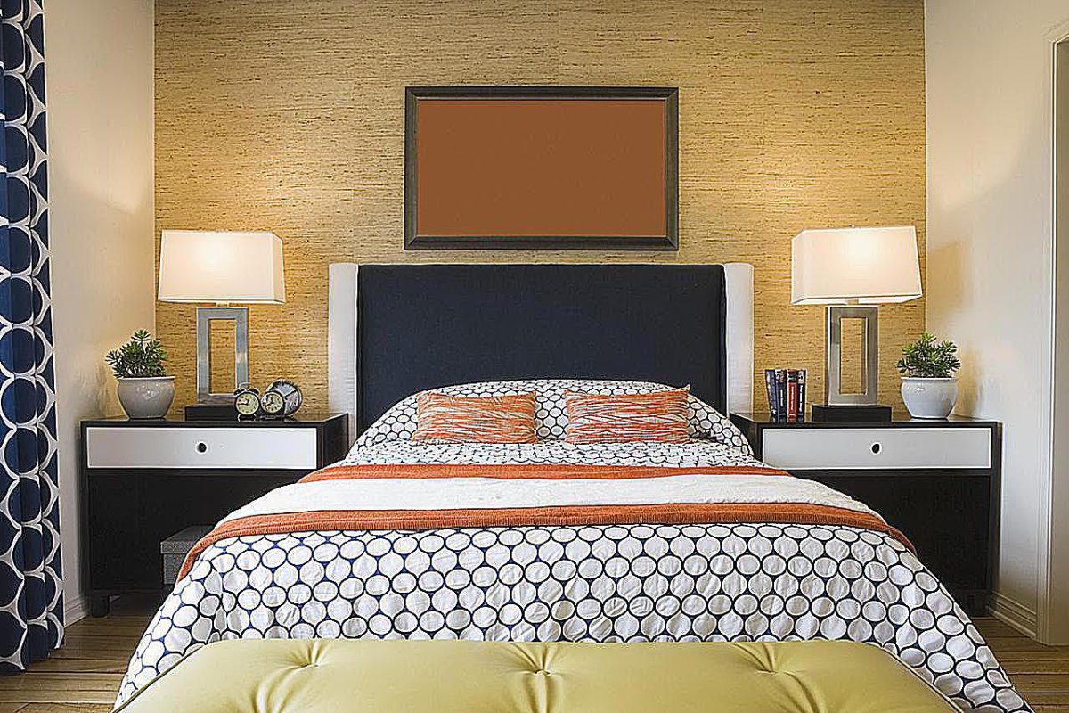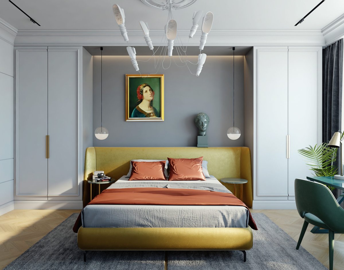 34. Интерьер загородной спальни в серо оранжевых тонах