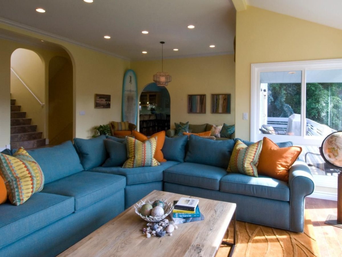 13. Синий диван с желтыми подушками