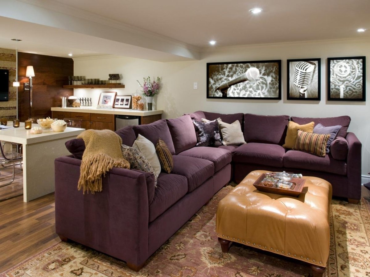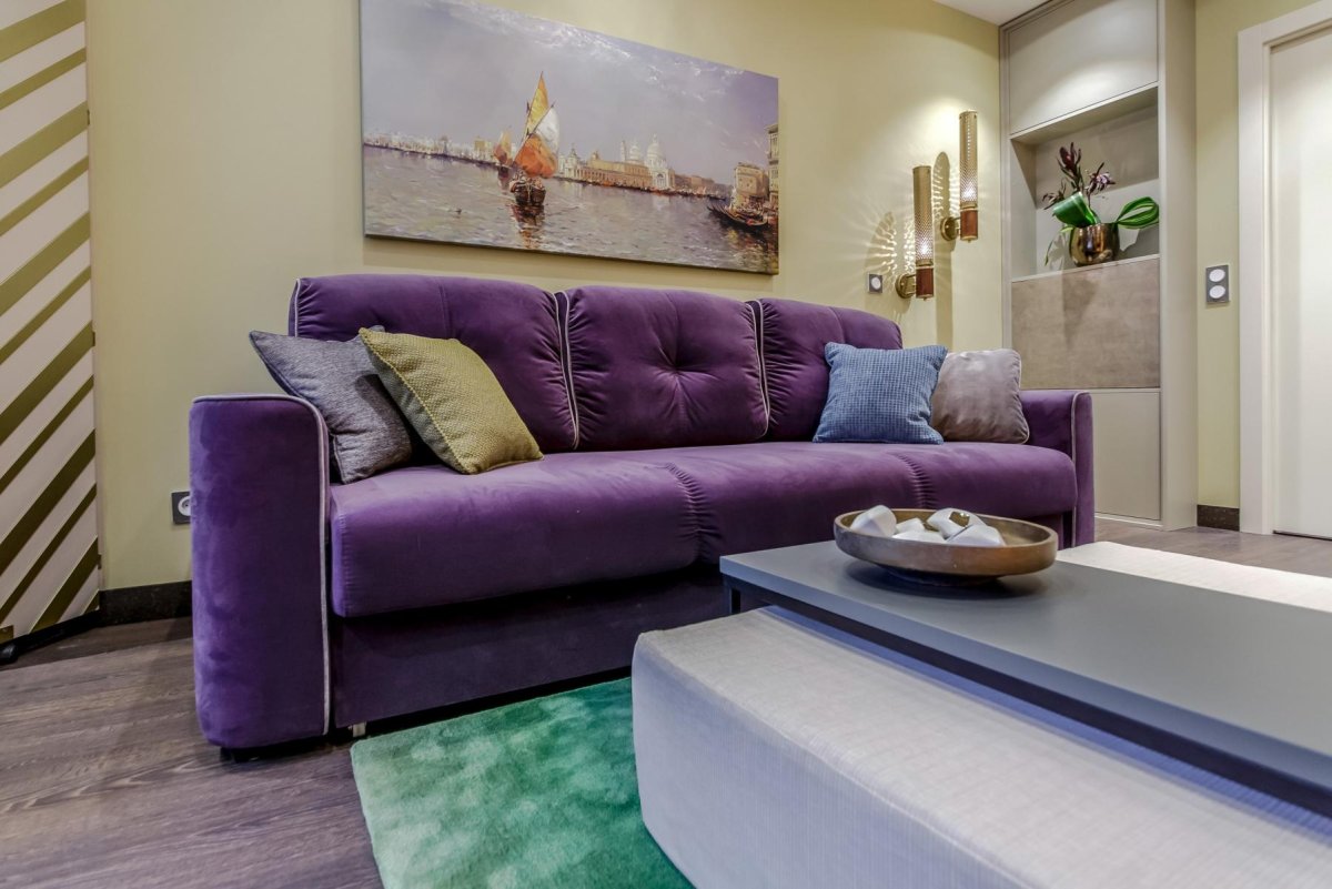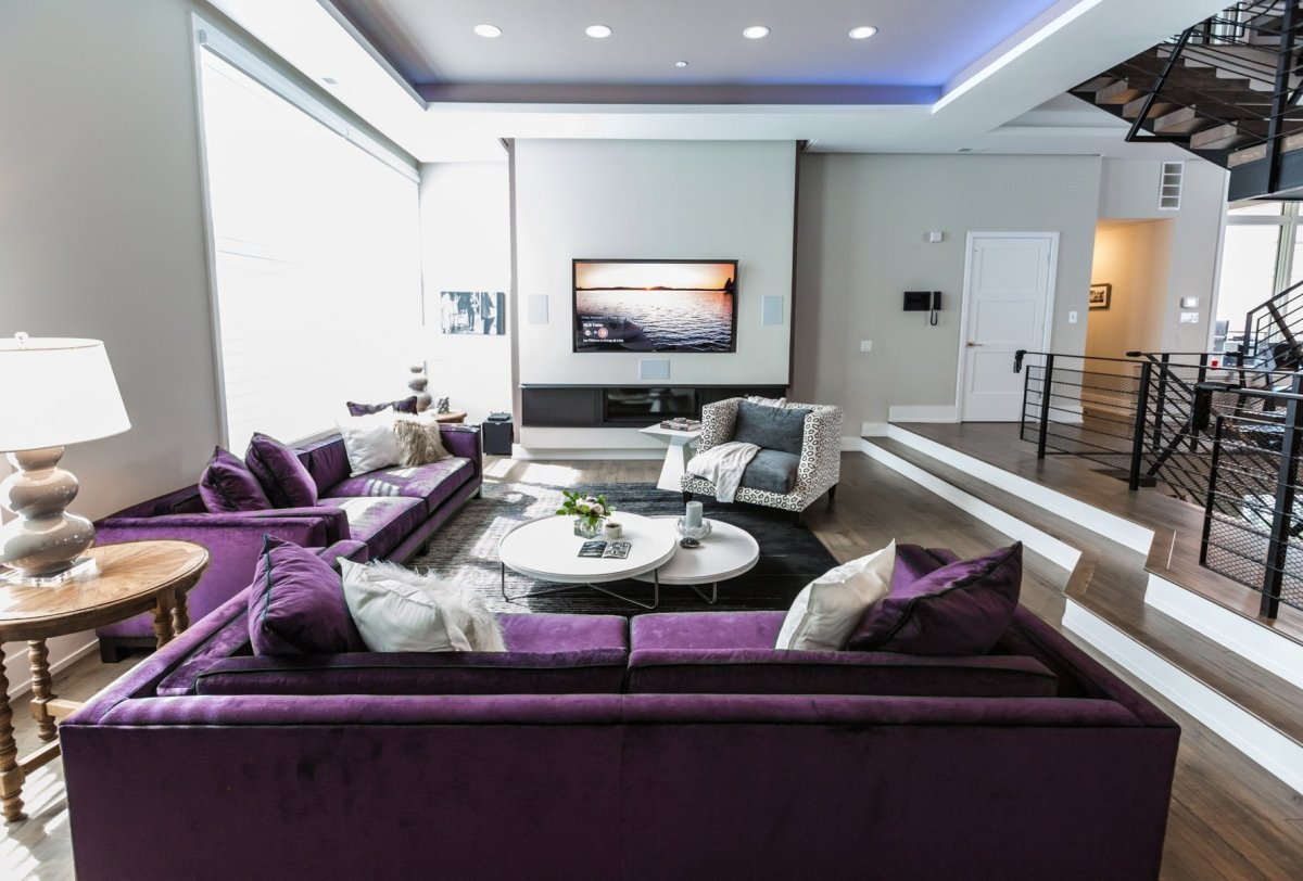 8. Гостиная с фиолетовым диваном и серыми обоями
